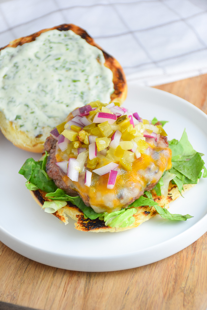 8. Toppings- Nobody wants a huge piece of iceberg lettuce sliding out from their burger causing a huge mess. We like to chop up the toppings and place them on the bun. Shredded romaine lettuce first, then patty, then chopped mix of equal parts red onion, dill pickle and pickled jalapeños. Sweet burger perfection. And don’t worry, your pliable, fresh brioche bun will hug those toppings.