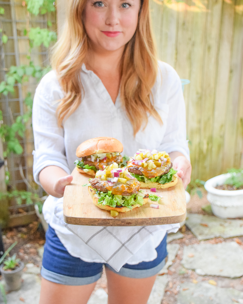 - Meat to Fat Ratio: Ah yes, everyone’s favorite topic. The standard burger is usually ground beef with an 80/20 ratio… and these turn out pretty darn well. However, I try to use better-for-you ingredients from small producers as often as possible. We have found that 85/15 grass-fed ground beef has an excellent earthy flavor without being too lean. And no one could taste the difference but my soul felt better about serving this meat to our guests. PS- we’ve tried leaner meats and turkey/chicken options and mixing them in with beef and it just isn’t the same.