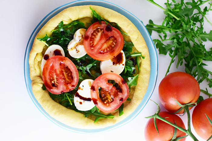 On Mondays I am always looking for easy, sorta healthy recipes that I can whip together in no time! I like to think that I would always get eat something super healthy to start off the week but lets be honest I really just want something good. Enter this easy, meatless Monday recipe. Since it’s summer there are plenty of gorgeous ripe tomatoes and they pair perfectly with some fresh greens and thick slices of mozzarella of course. Because salad on pizza should totally be a thing, don’t ya think?