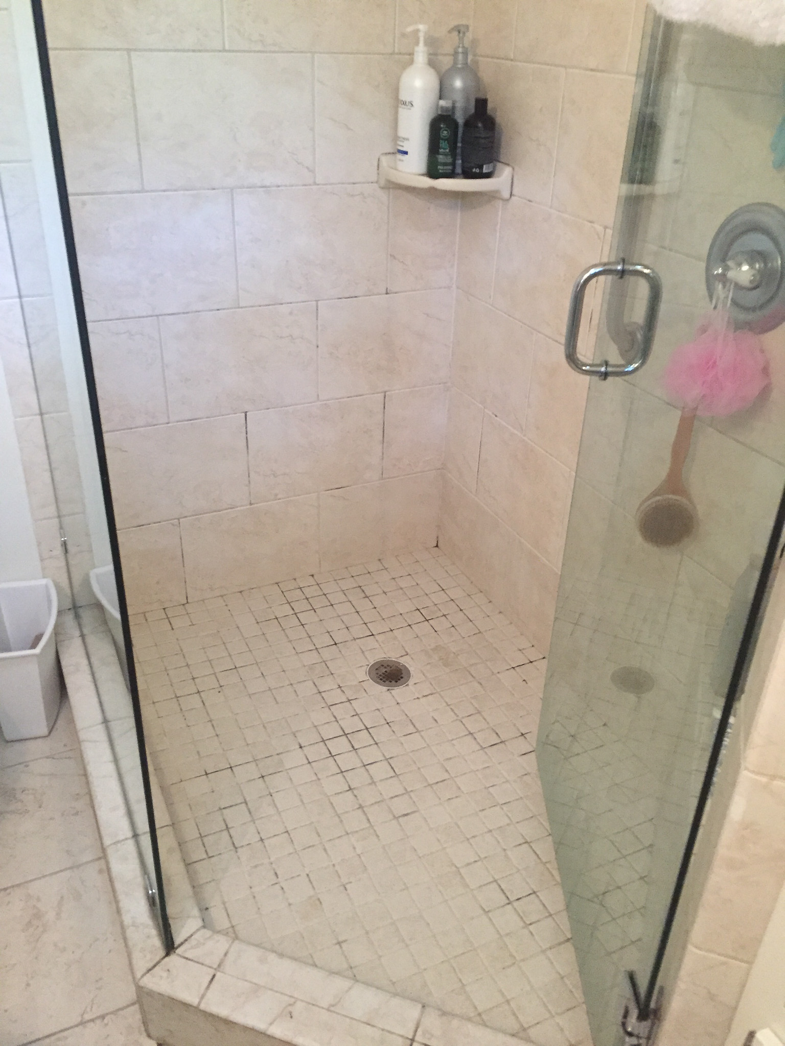 The shower while spacious wasn’t exactly what I would call welcoming or spa-like. It was old and grungy and need of a deep clean and facelift. We had some work done to the house after we purchased it but before we moved in. During that time the bathroom walls were smoothed and painted white and that’s the way they stayed until we decided to do this renovation about a year later.