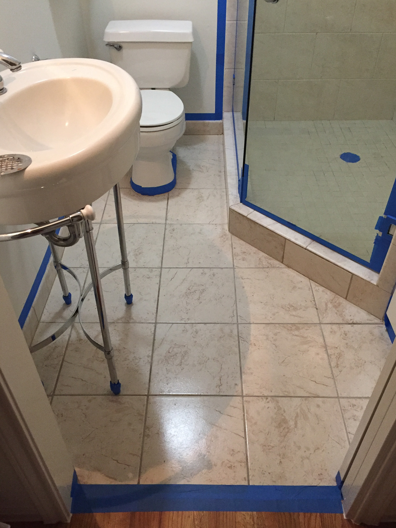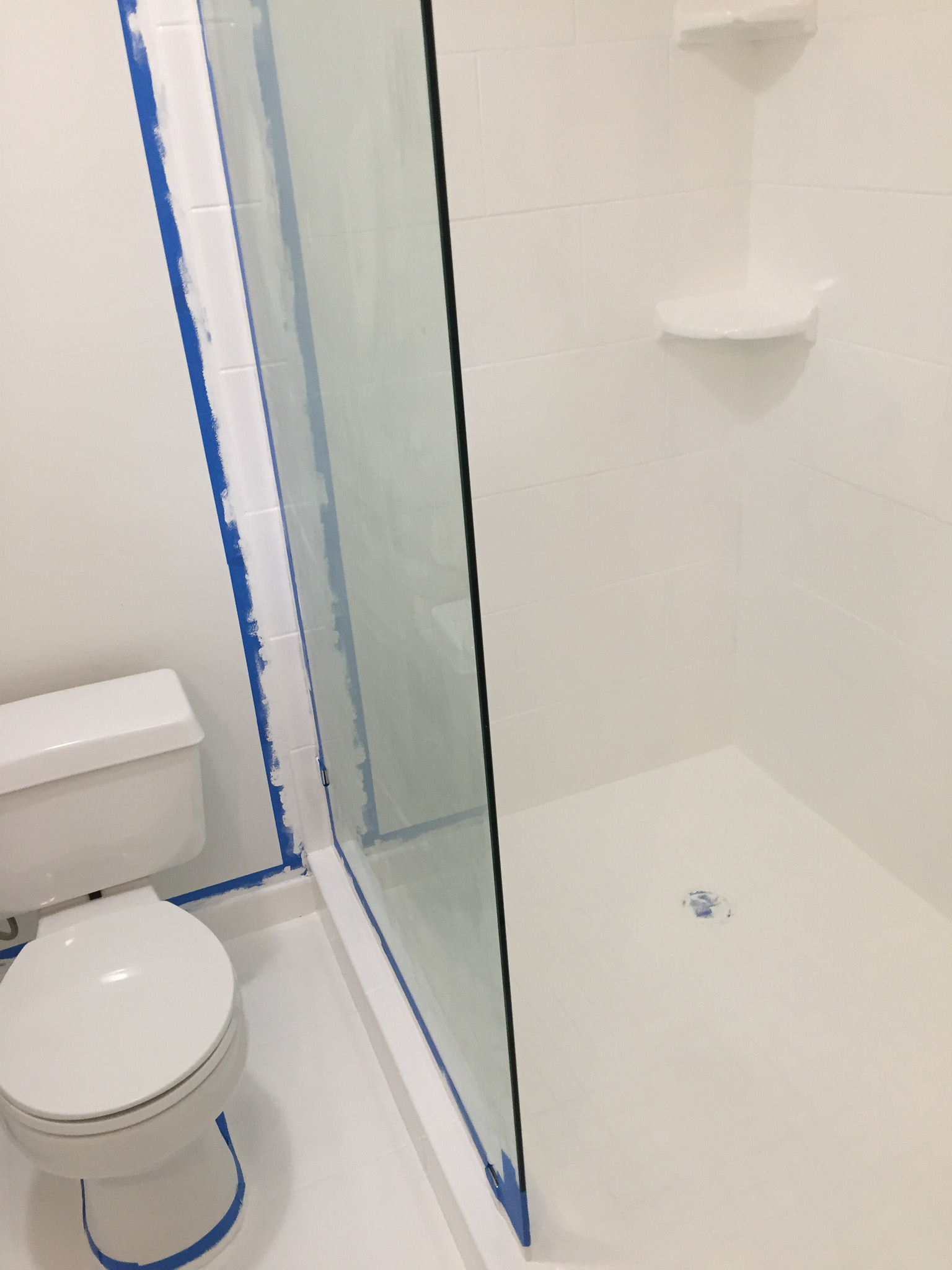 during the cleaning process. Also, make sure it is very dry. We moved into our other bathroom while we worked on this one because you won’t be able to shower in it for several days.