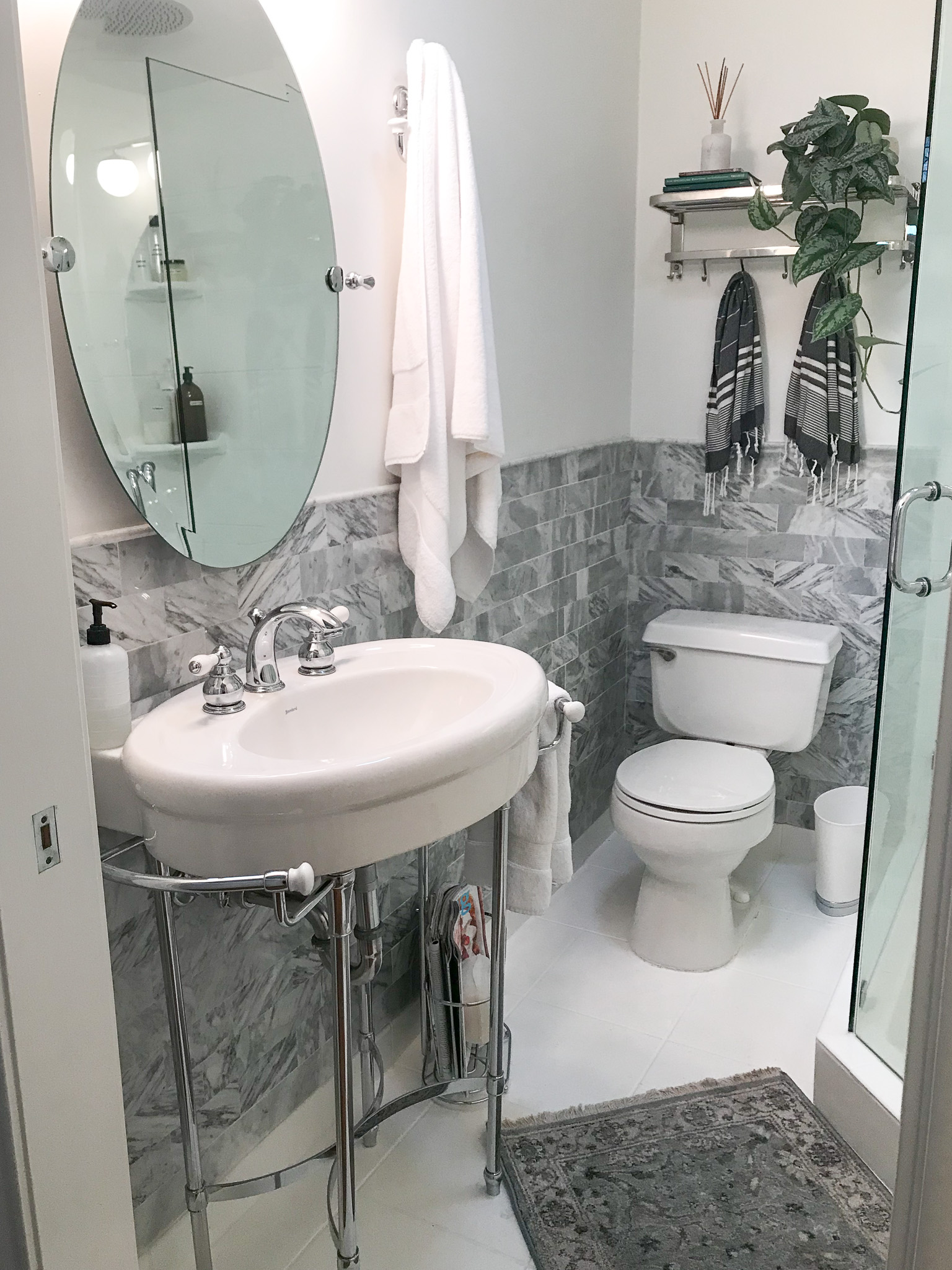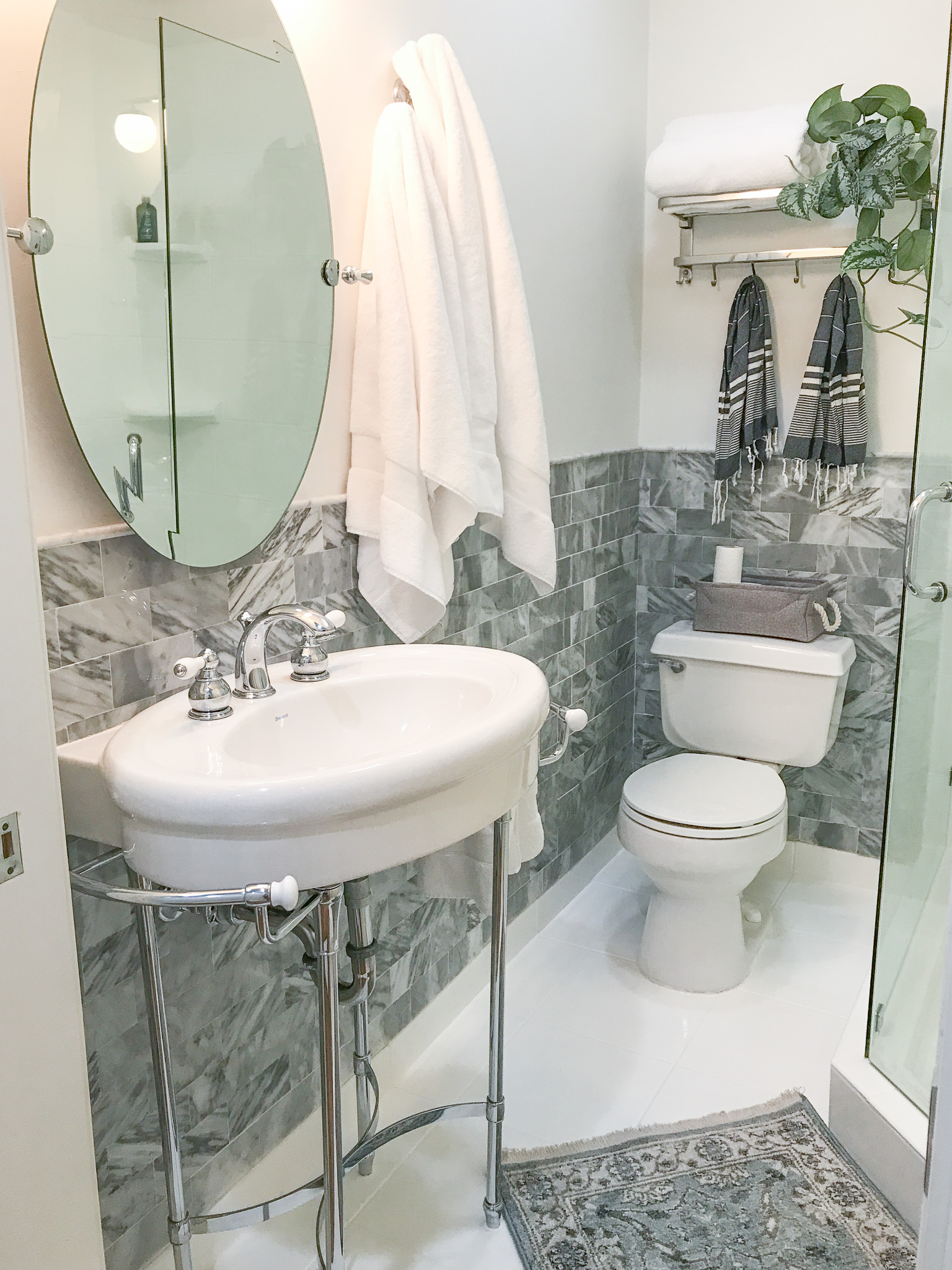 We wanted to give our bathroom a modern, clean update without blowing our budget. We had lived in the house for a year and I spent lots of time thinking through all the ways we could make this tiny space work for us. The actual shower is a decent size but the bathroom only has one pedestal sink and a small cabinet, so I have a vanity in our bedroom that I used for getting ready i.e. hair and makeup.