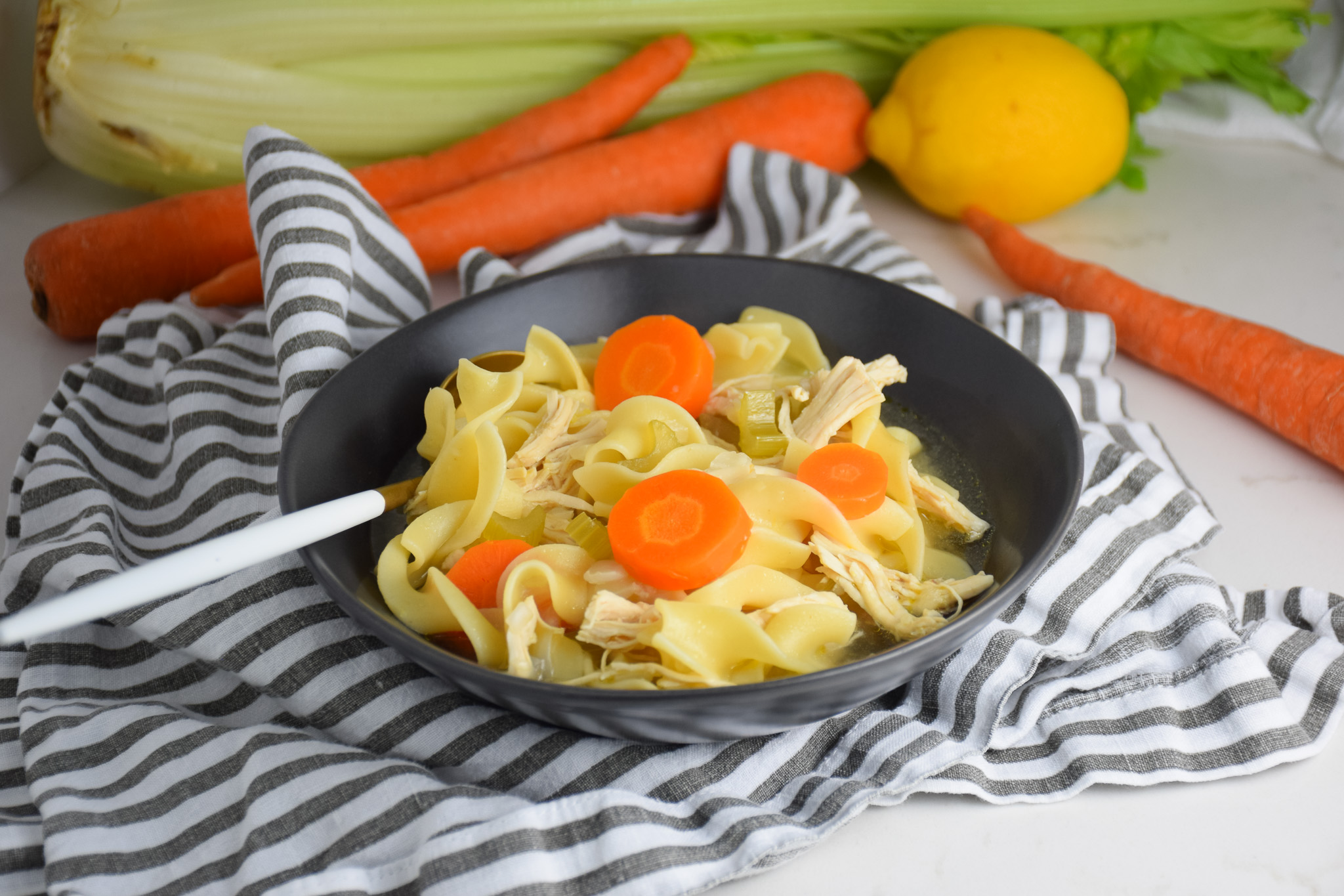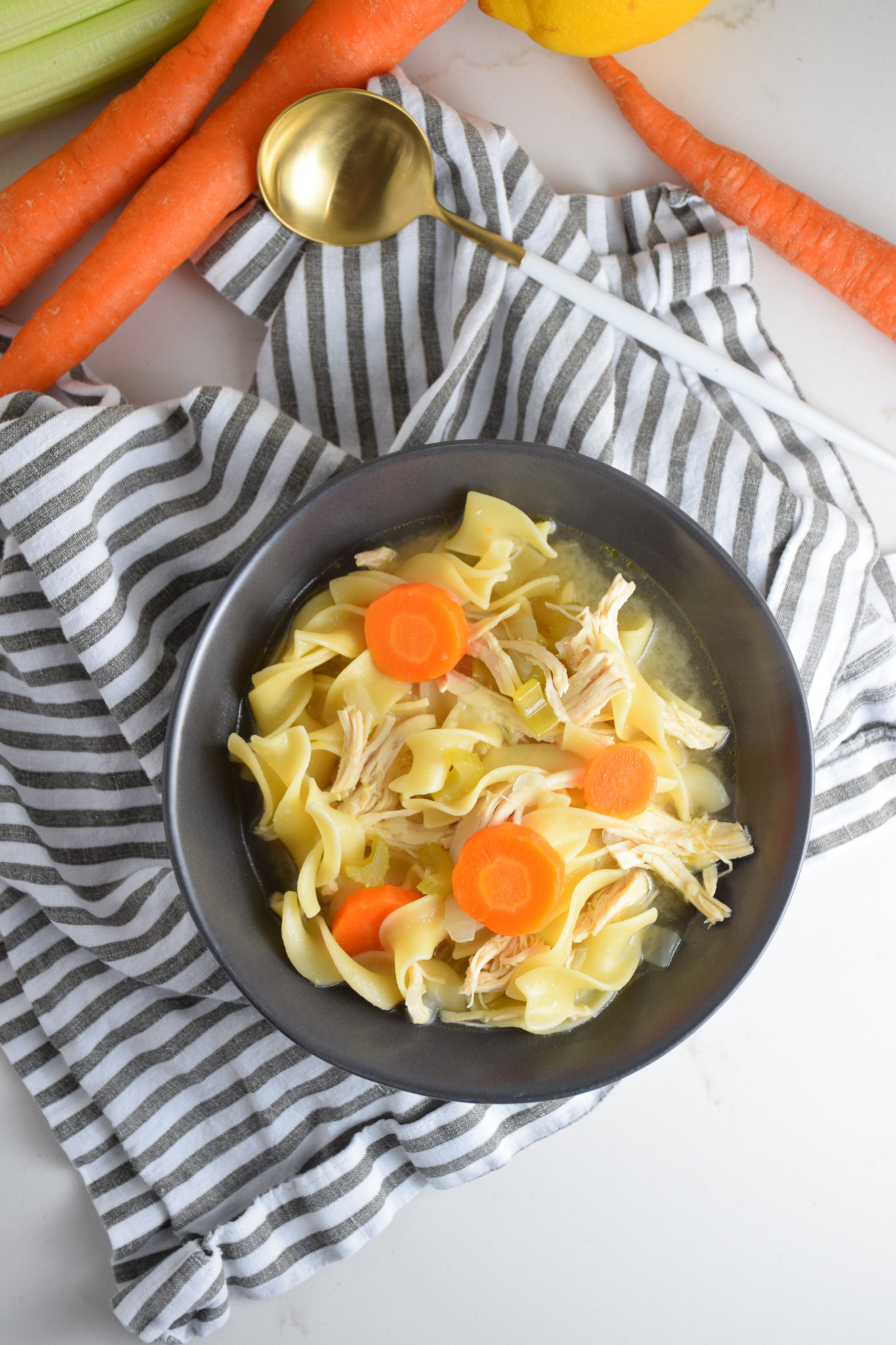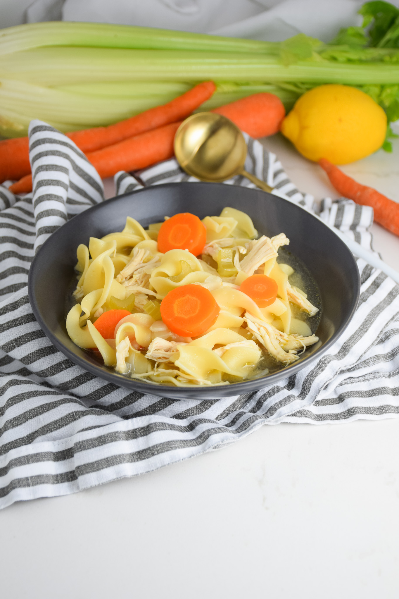 Having a good go-to chicken noodle soup recipe is always a good idea! It’s one of those universally loved recipes. When you are feeling sick, chicken noodle soup. If you want to comfort someone, chicken noodle soup. When you aren’t sure what to eat, chicken noodle soup. It’s just one of those recipes that you want to have handy. Luckily for you, this one is super simple to make with just a few pantry staples!