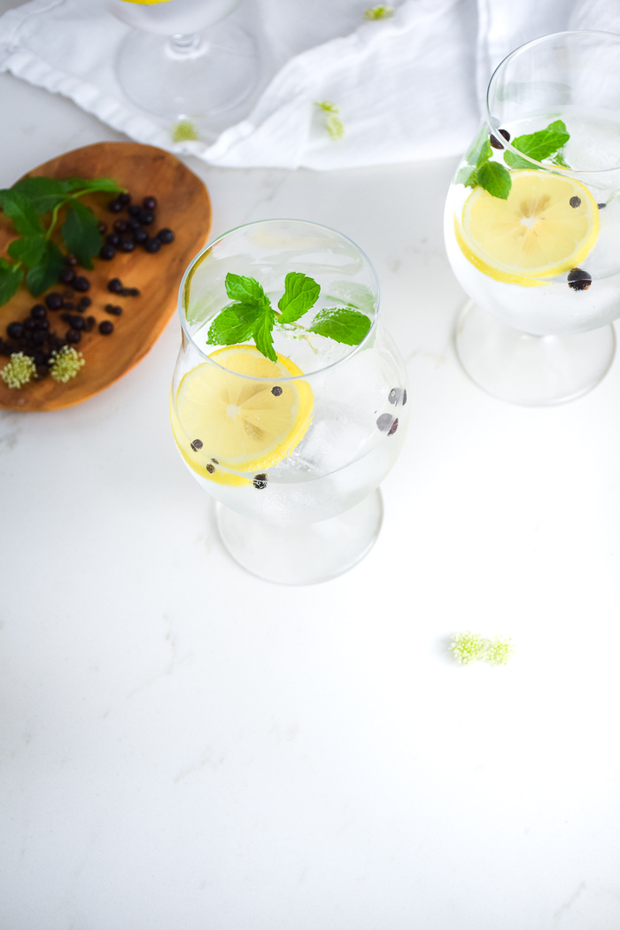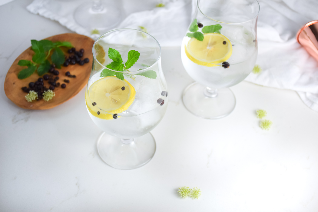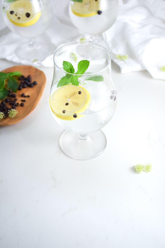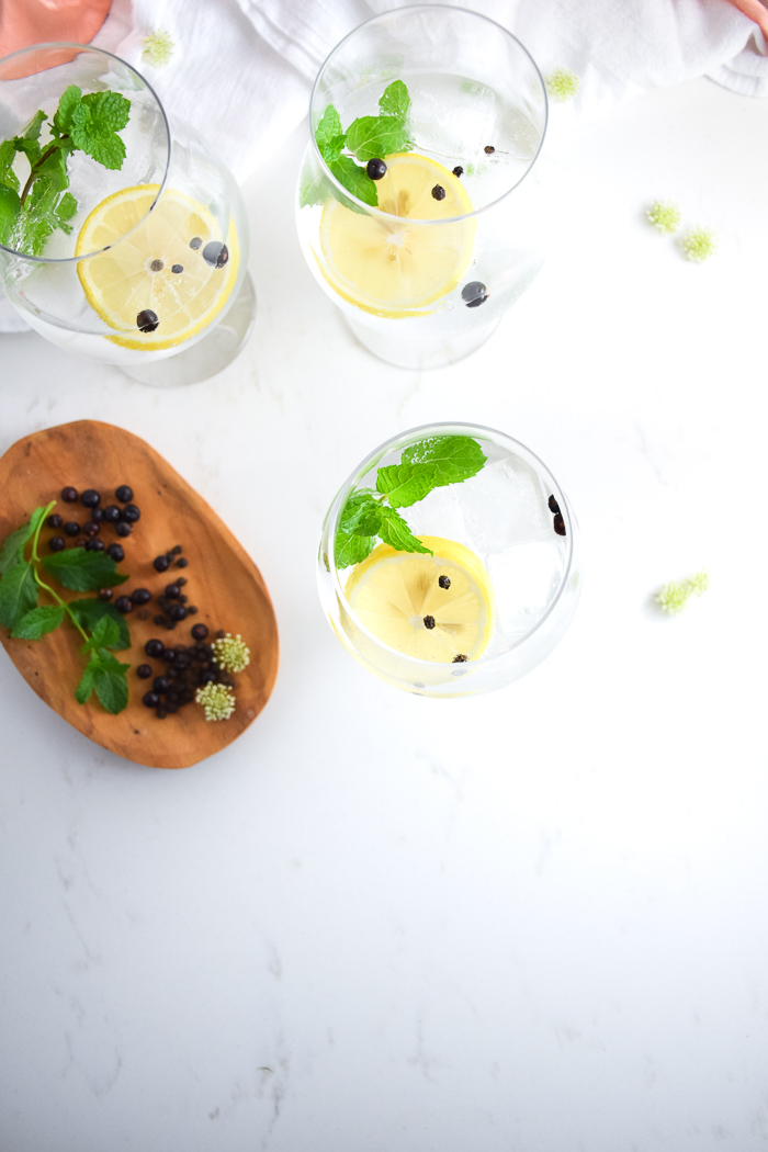 For the herbs, I used mint because it is going crazy in my herb garden right now! Sprigs of thyme, rosemary, and even sage would work particularly well in a Spanish Gin & Tonic. Peppercorns and Juniper Berries are also key to this drink. Peppercorns impart a bit of spice while Juniper Berries provide an earthy, licorice aroma. Whole black peppercorns are preferred. I would not suggest using ground peppercorns because they would get a little itchy on the throat. I thought Juniper Berries would be hard to find but I realized many grocery stores carry them and you can get them for pretty cheap on Amazon.