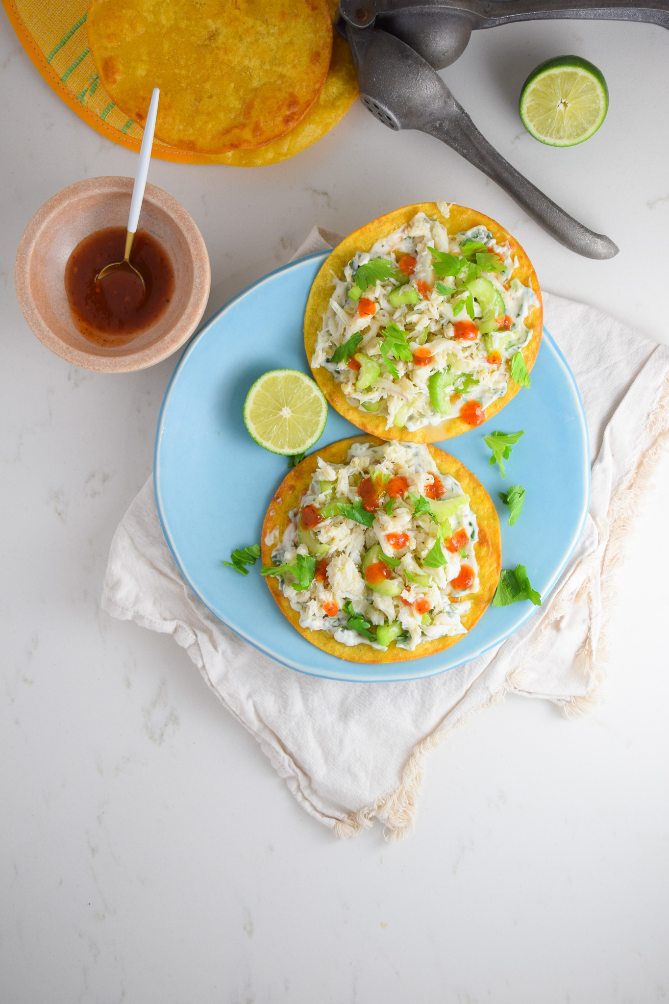 Fresh, bright, crunchy and oh yeah, delicious! These crab tostadas have been on my cravings list lately. They are so easy to make and the fresh lime juice really punches things up in terms of flavor. I definitely recommend taking the extra few minutes to fry your own corn tortillas to make the tostadas. You could just buy them but it’s not the same. That little extra step is what will take this dish from good to great.