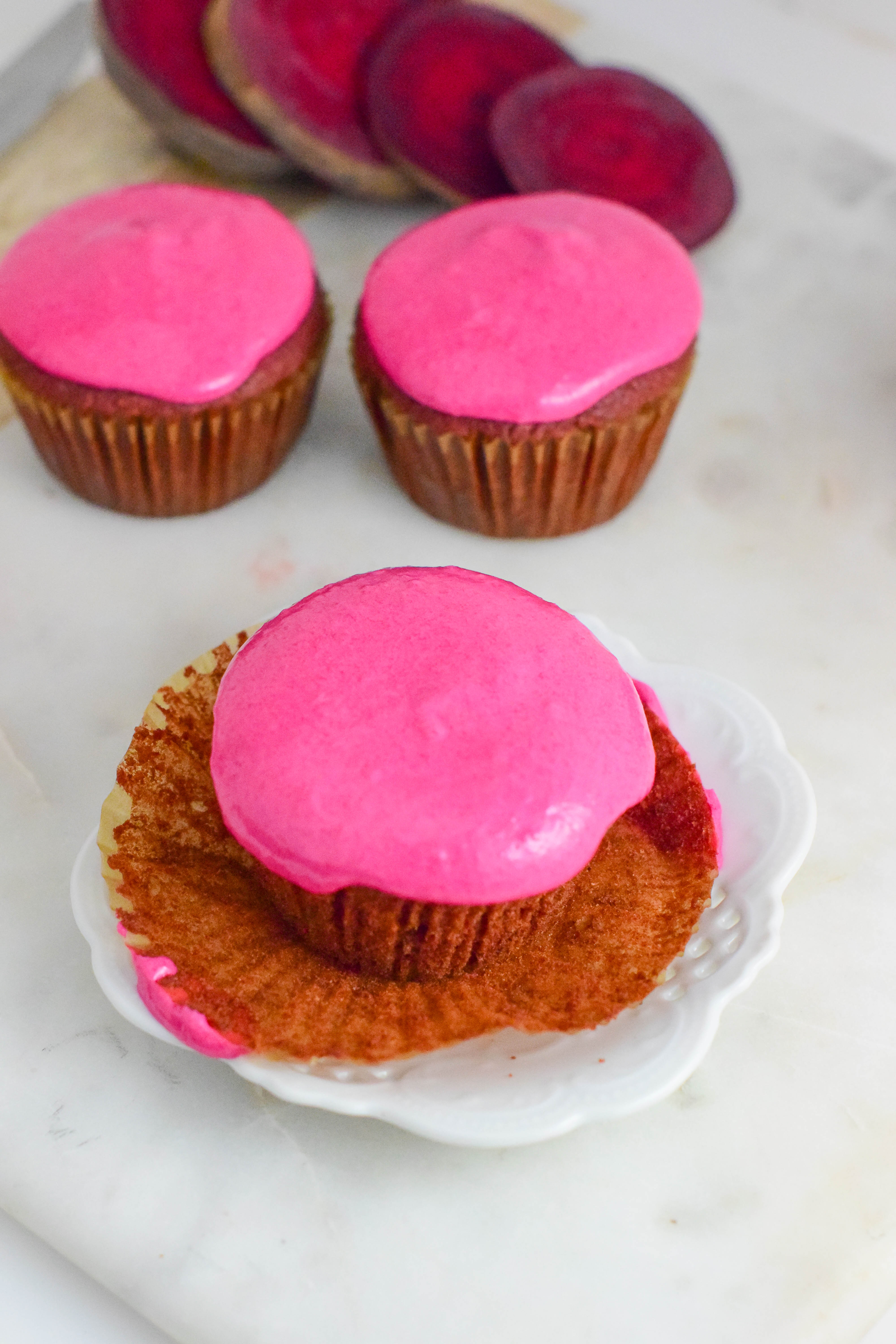 - For the frosting, let cream cheese soften at room temperature then beat until fluffy. Add in beet root puree and vanilla until combined. Then add powdered sugar one cup at a time until smooth. Let frosting chill in the refrigerator for 30 minutes.