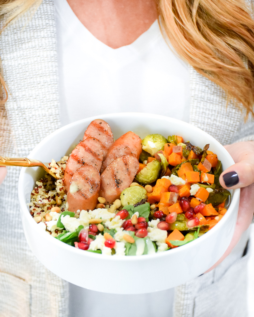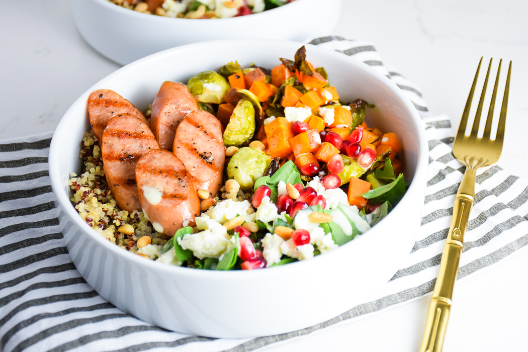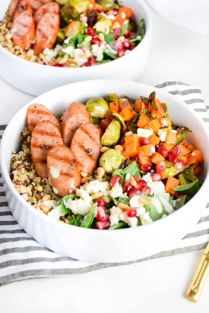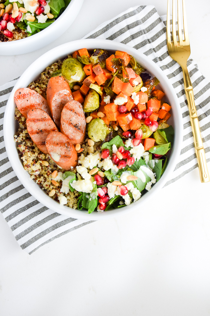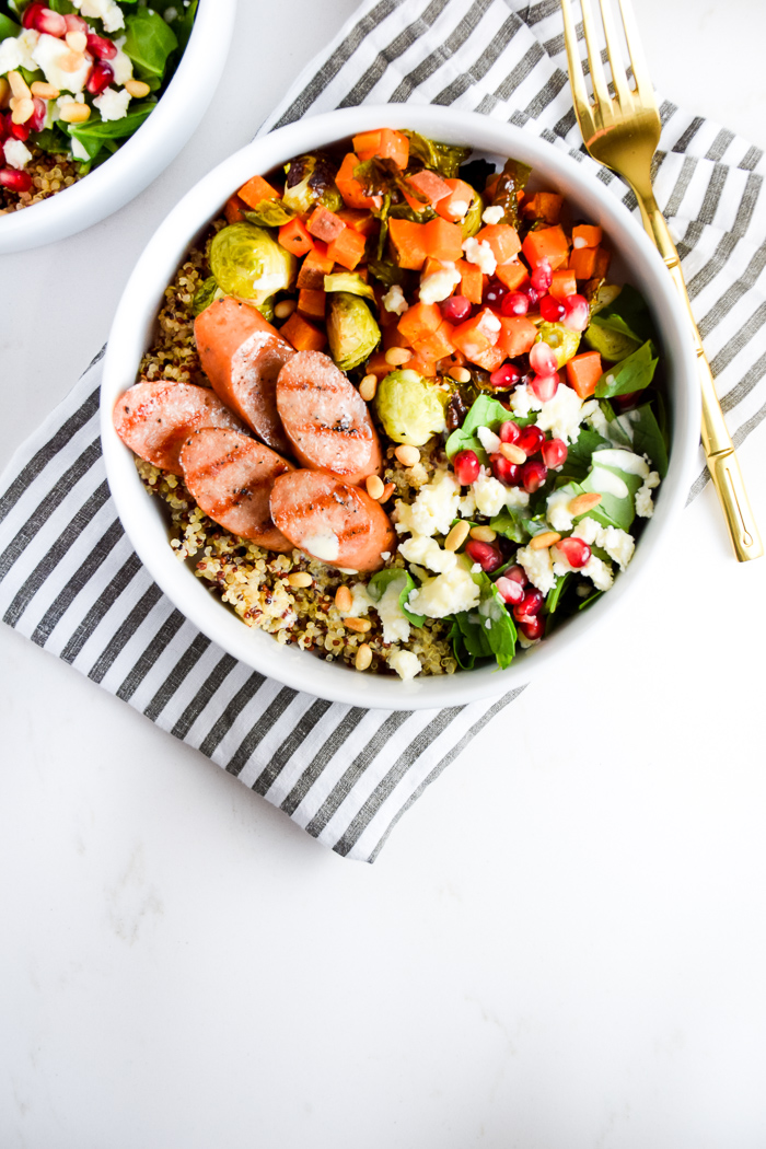- Compile bowls by dividing quinoa into bowls first then topping with roasted veggies and chicken sausage or tofu or chickpeas. Then add torn greens and drizzle with dressing. Finish with scoop of pomegranate arils and feta.