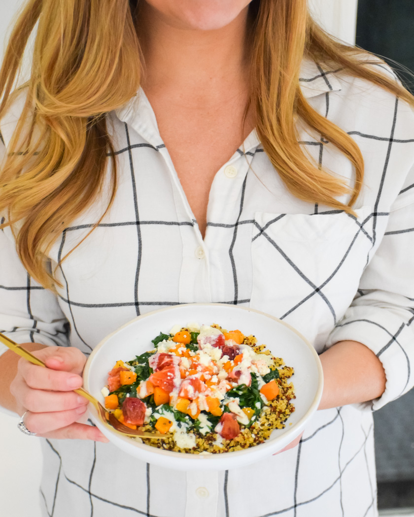 The same applies to veggie bowls. Find a great base. I like quinoa because it’s packed with protein, easy to prep ahead of time and is so versatile. I really love the sweetness of the butternut squash but a sweet potato would work just as well! What really gives this bowl it’s punch is the blood orange! It really brightens things up! You could sub in tangerines or sweet oranges too.