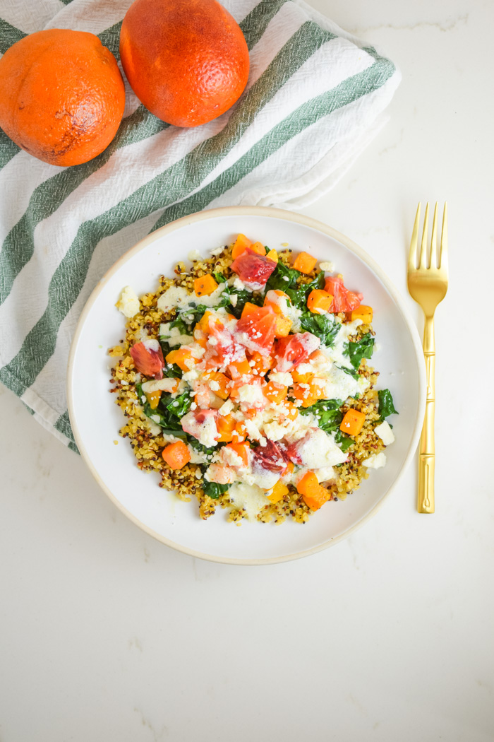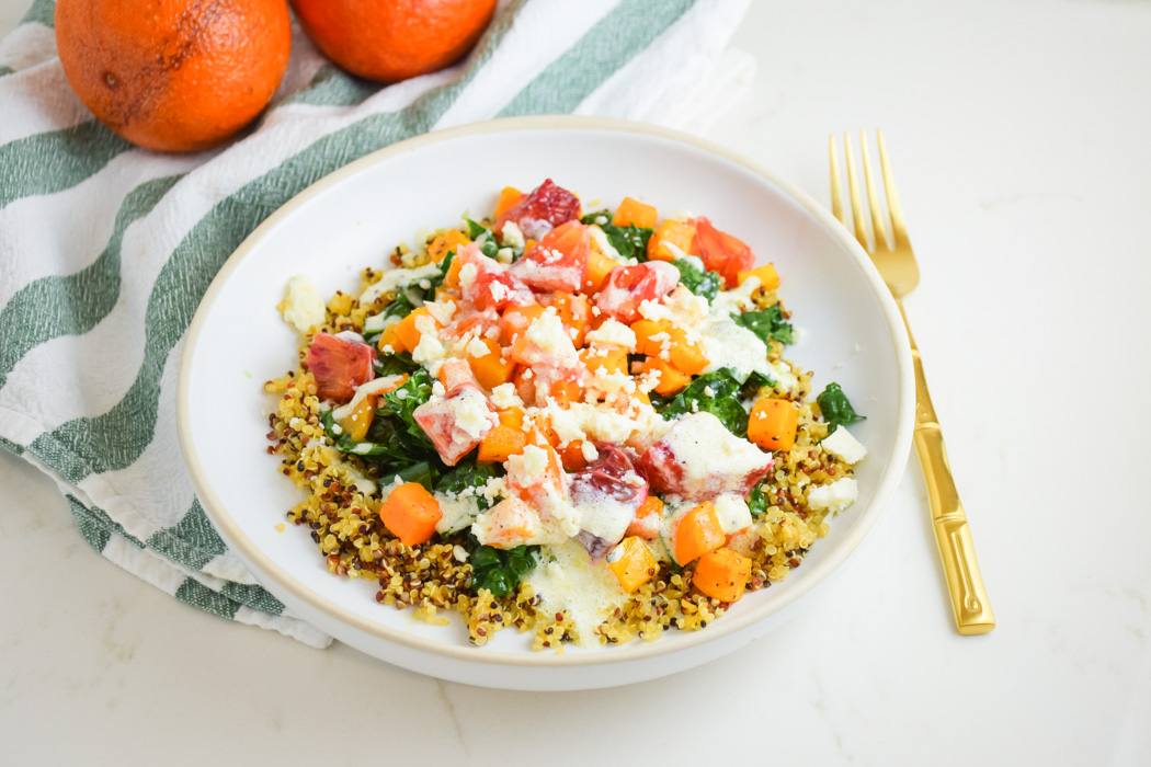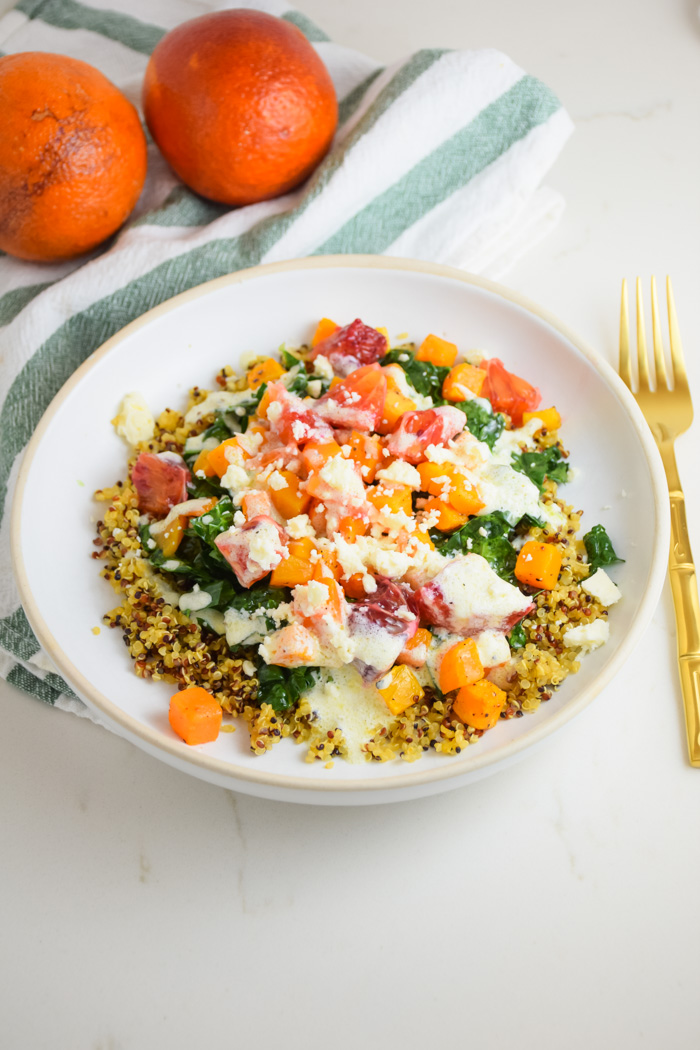 - Divide quinoa into two serving dishes, add kale then butternut squash. Top with blood oranges and feta and drizzle with creamy apple cider vinaigrette.