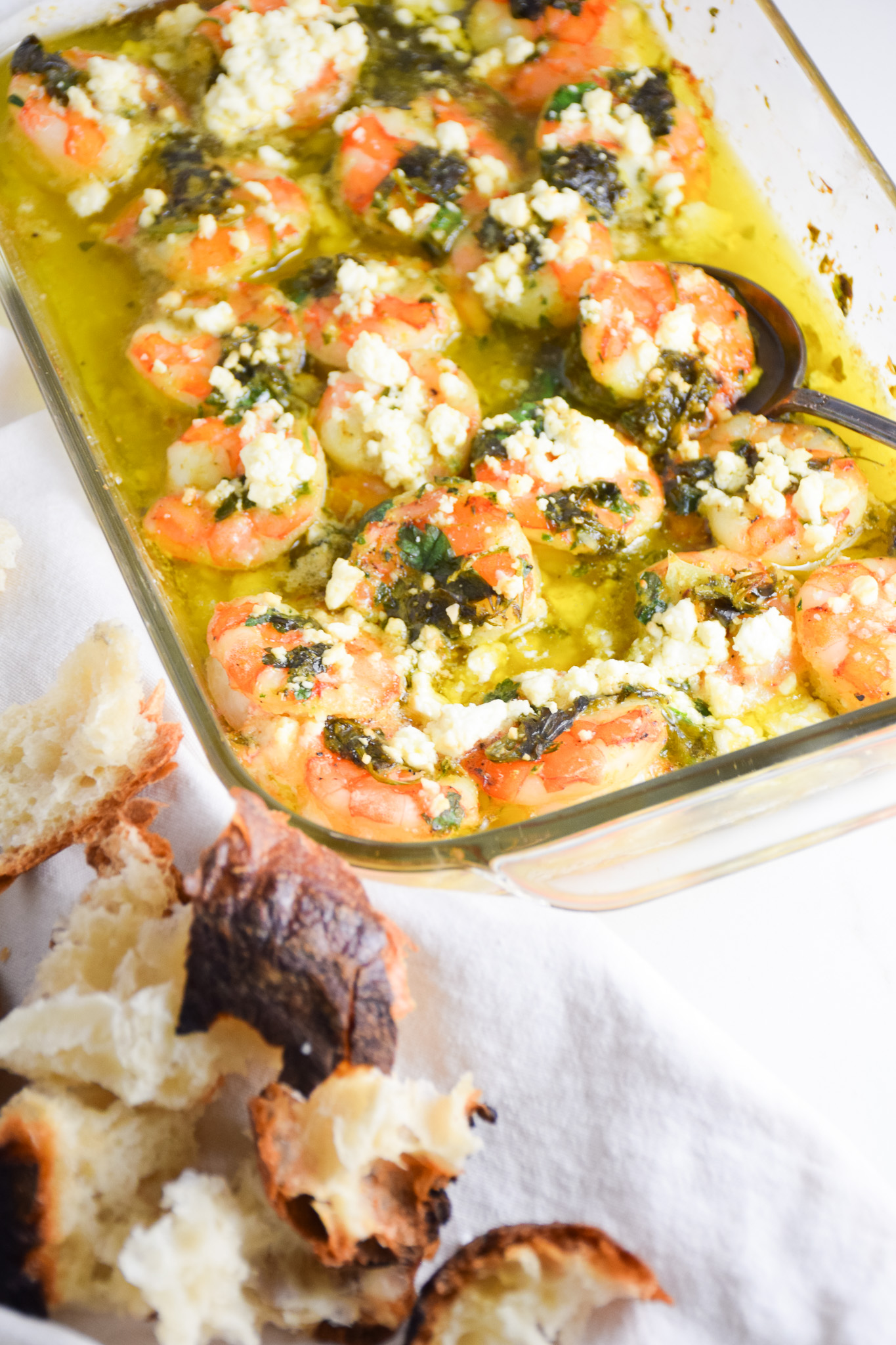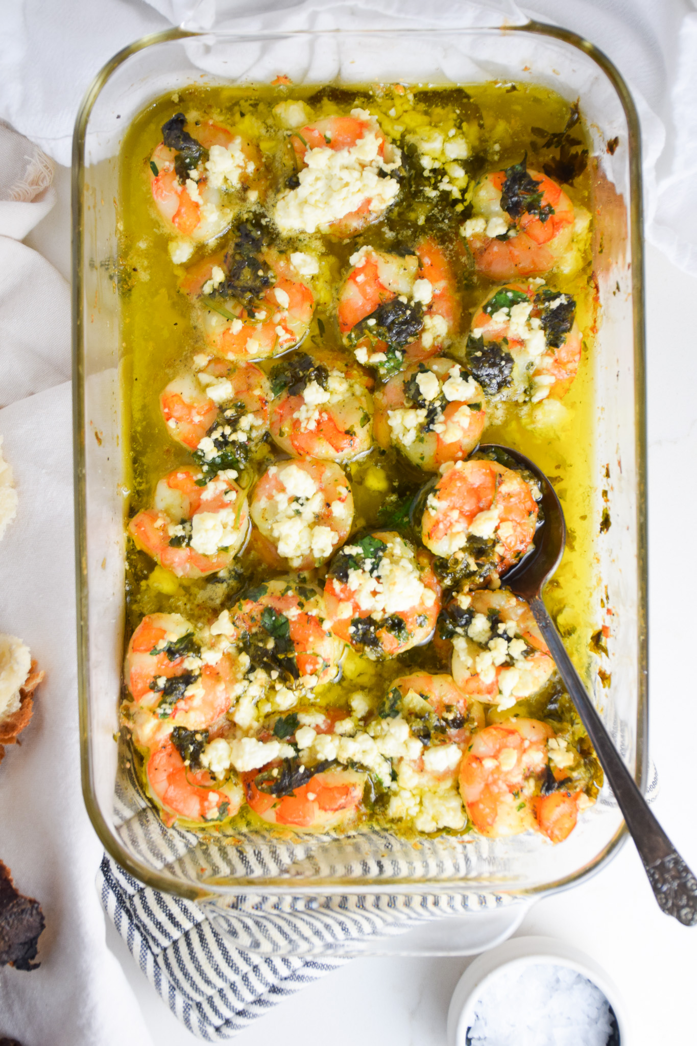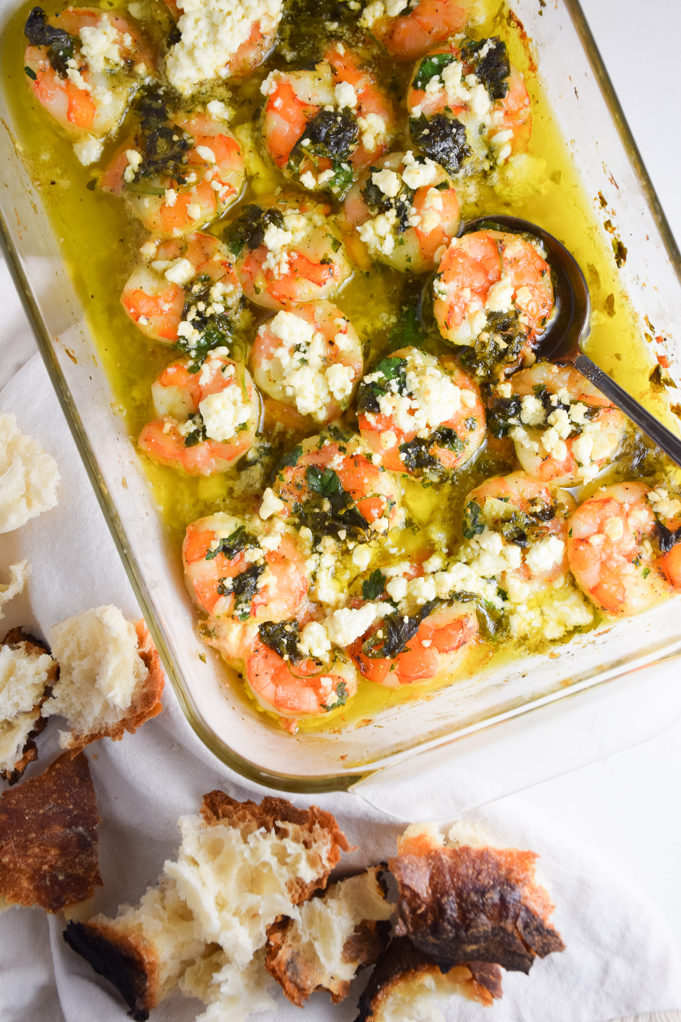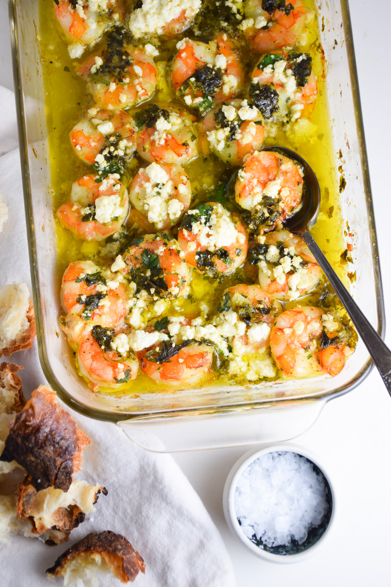 - Nestle shrimp into a shallow dish, topping with herb paste, and pouring olive oil into dish. Sprinkle feta on top.