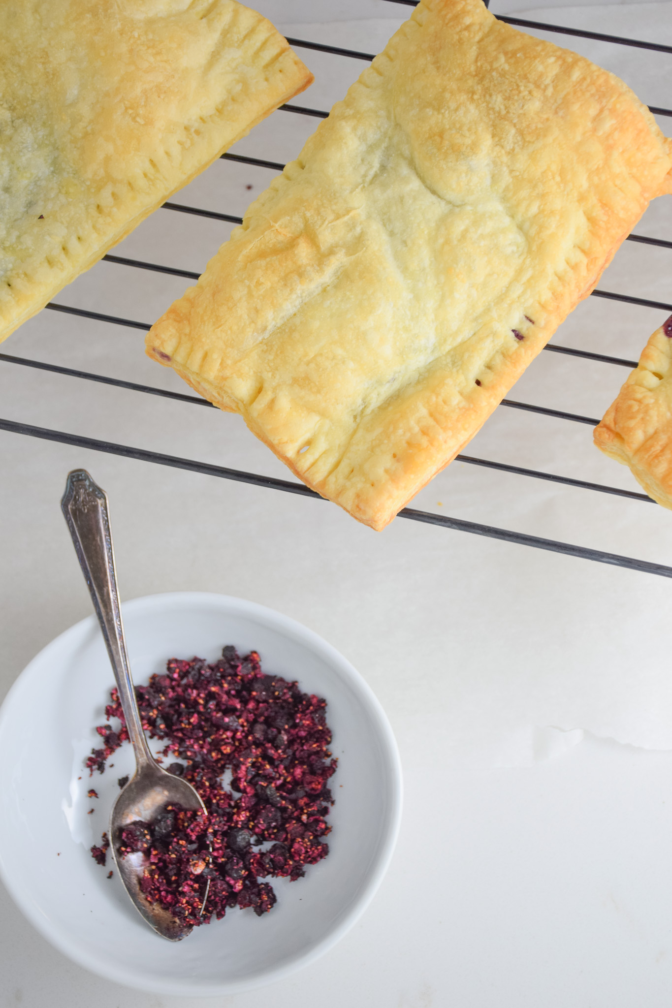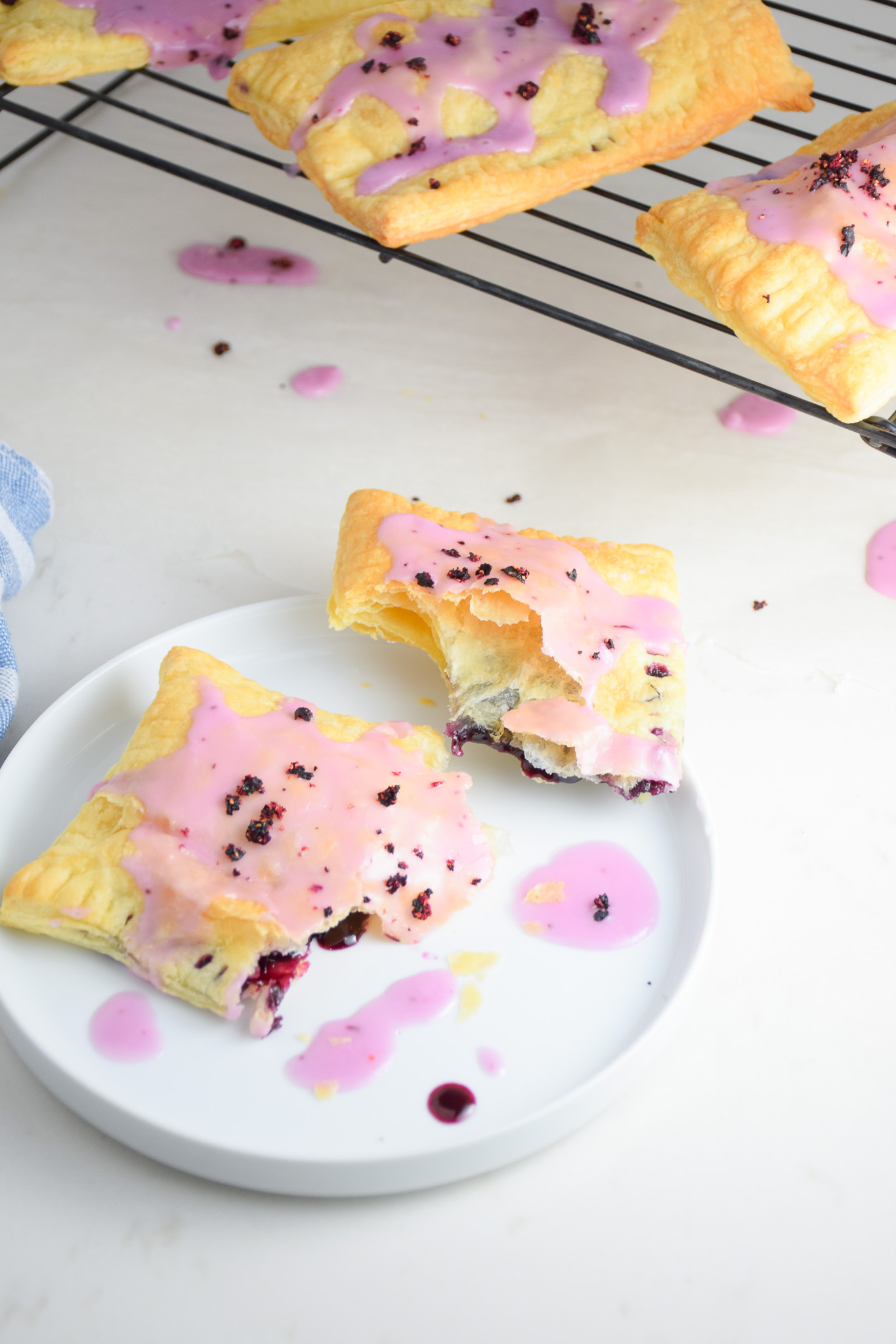 I used to love pop parts as a kid! They were one of my favs. As grown up, the dried out boxed version don’t quite do it for me anymore but the puffy, patisserie versions have me swooning. After always gravitating to the over priced pastries every time I was at a coffee shop, I decided to make my own version! These were surprisingly easy to make and the freeze dried blueberries add the perfect amount of tart to this sweet treat!