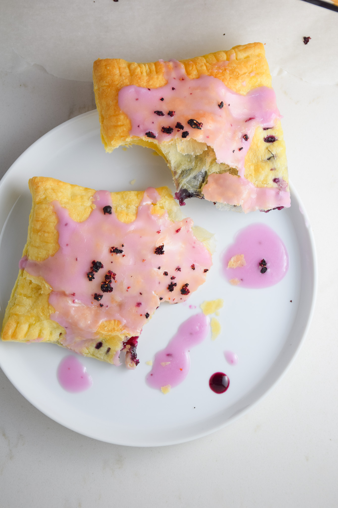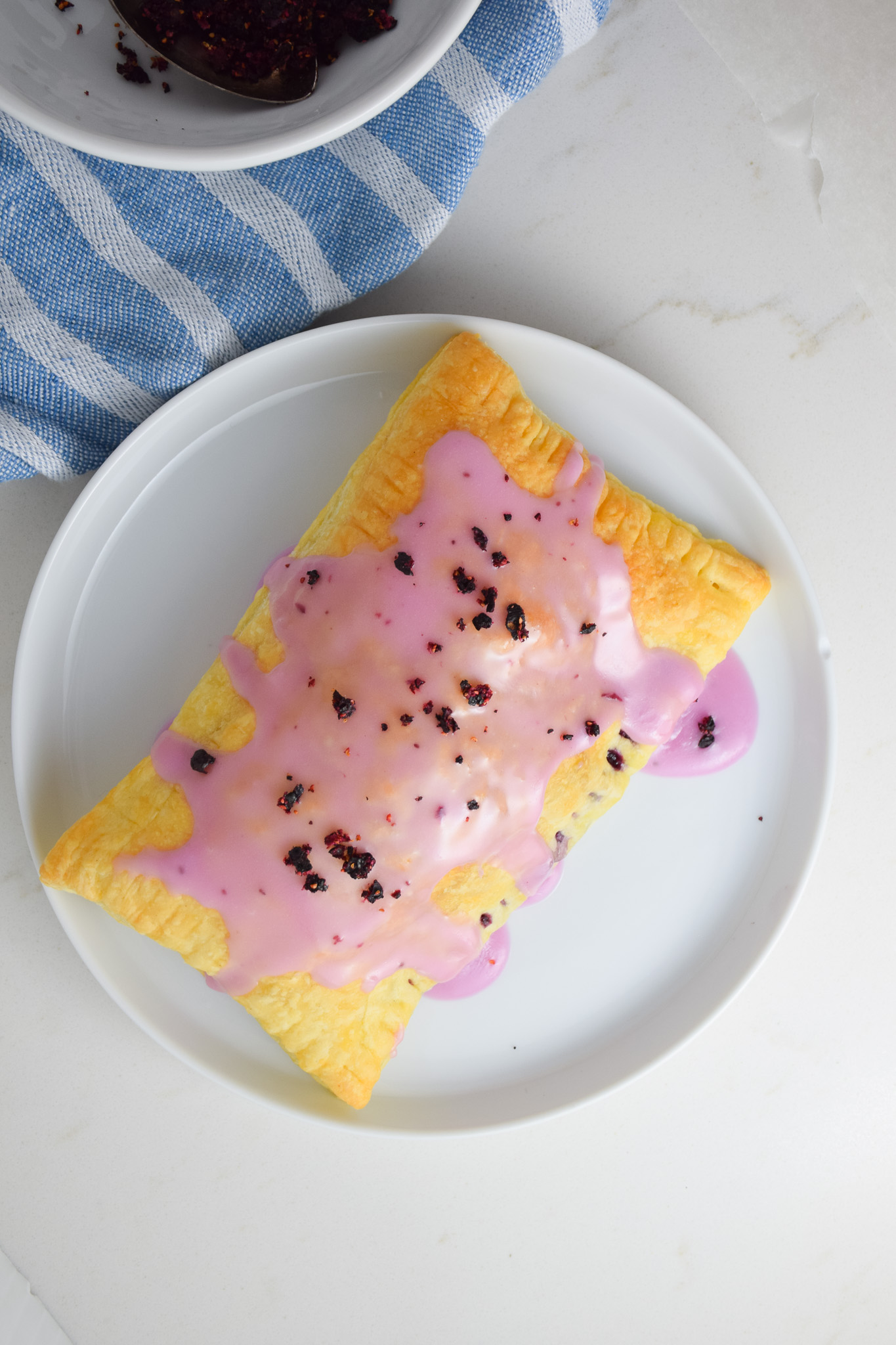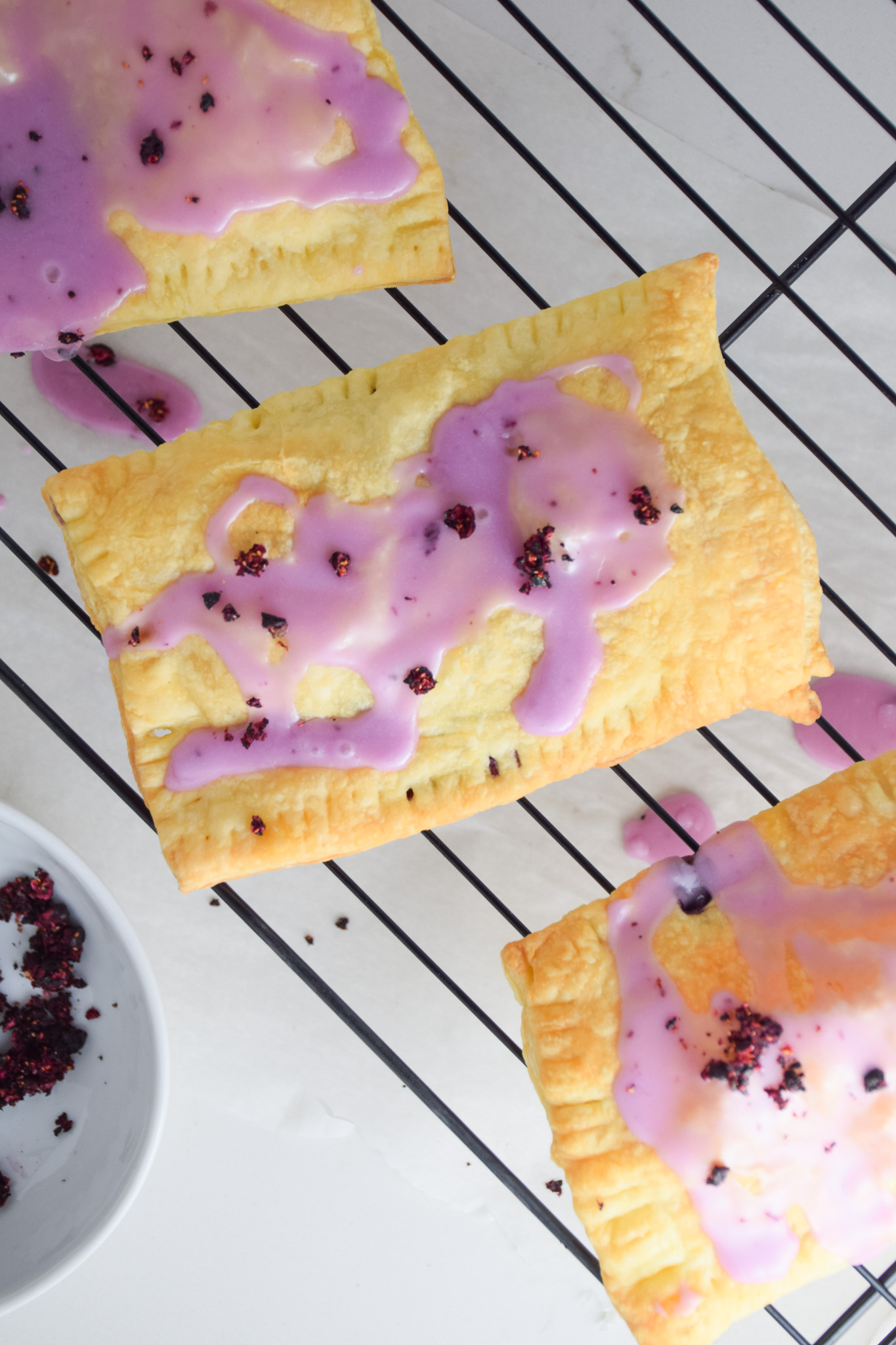 - Spread icing over warm pop tarts and sprinkle with crushed freeze dried blueberries.