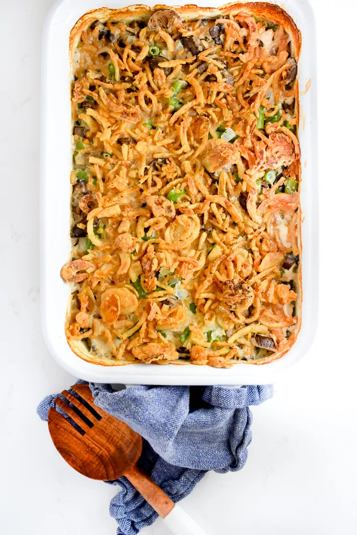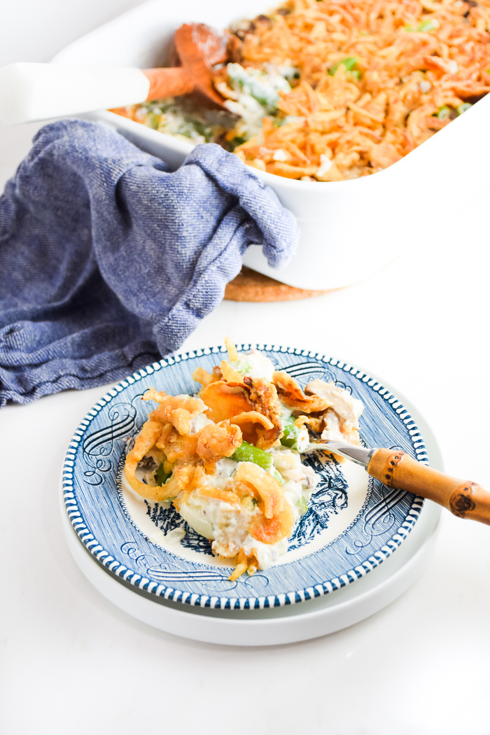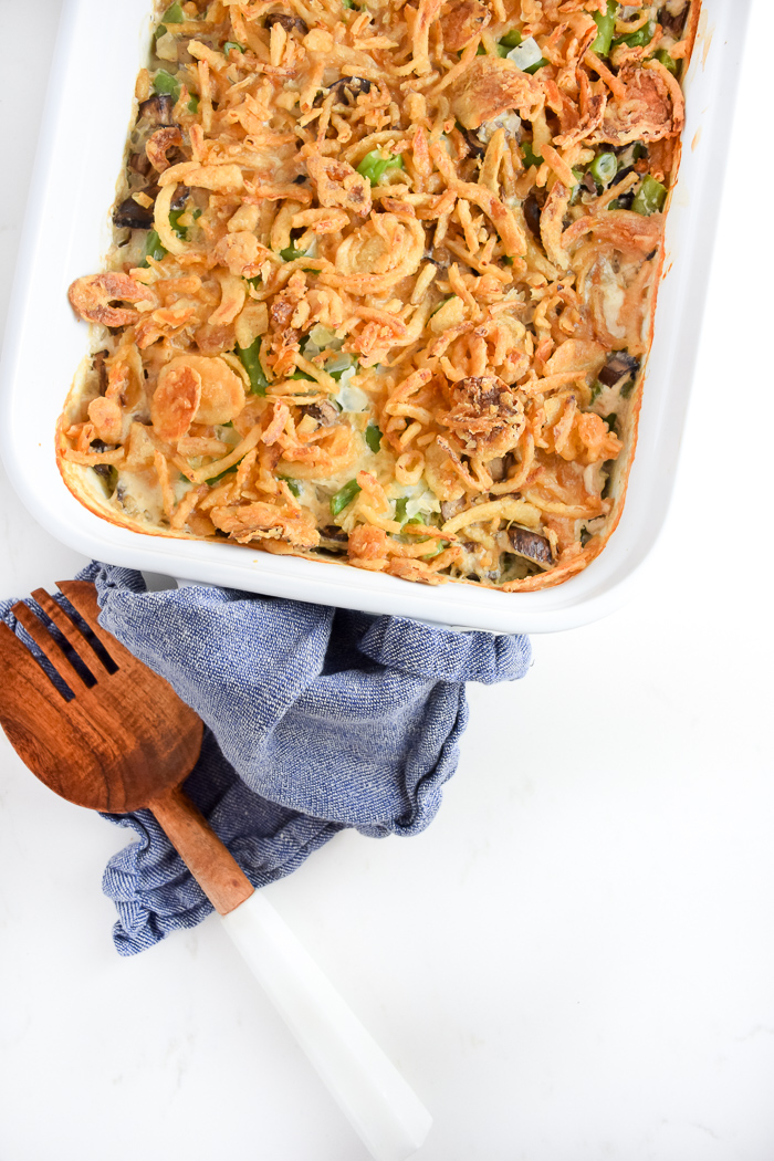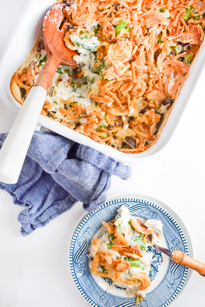 There is something about Green Bean Casserole that always makes me think of the holidays. Is that just me? It’s really the only time of year my family makes this dish, so I suppose that is why. I guess it’s sort of like turkey in that way. I mean we only roast a turkey once a year haha! This year, I wanted to clean up this old school recipe and use more wholesome ingredients. You won’t find a can of anything in this recipe but you will find all those cozy, recipe vibes!