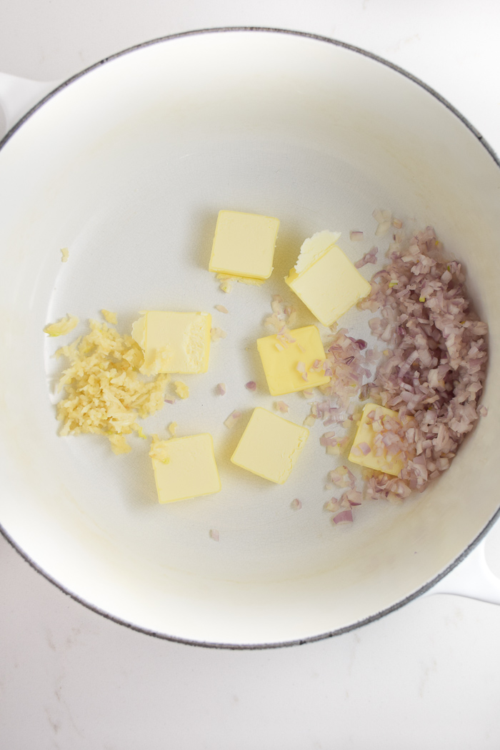- In a large heavy bottomed pot, sauté minced shallots and garlic with butter and salt until melted and fragrant. About 1- 2 minutes on medium heat.
