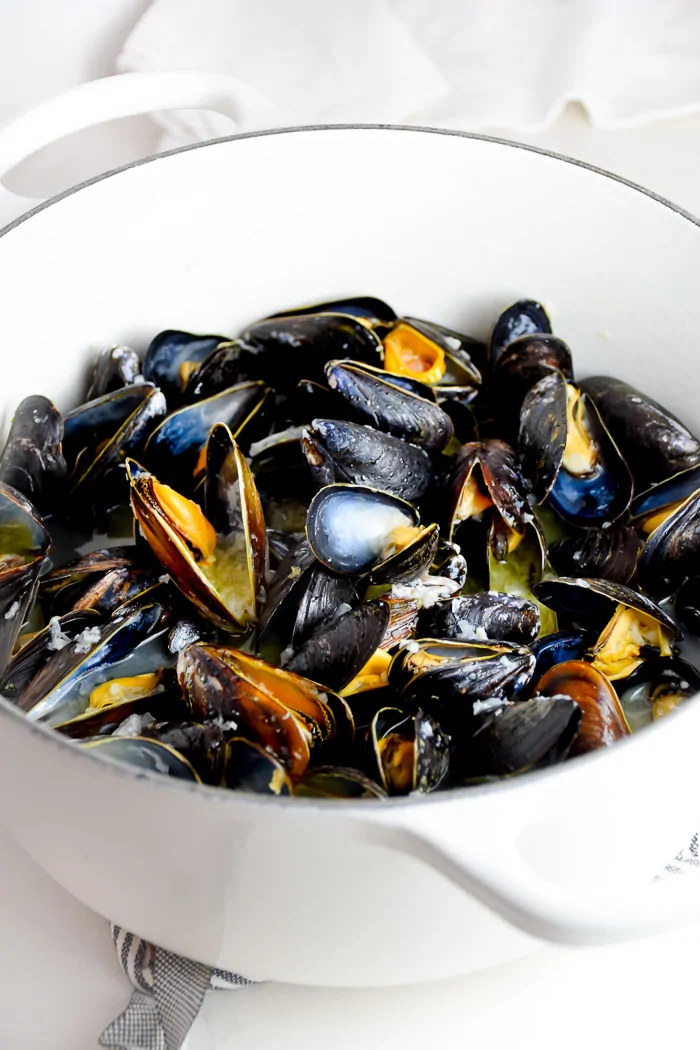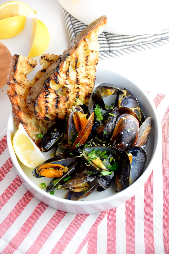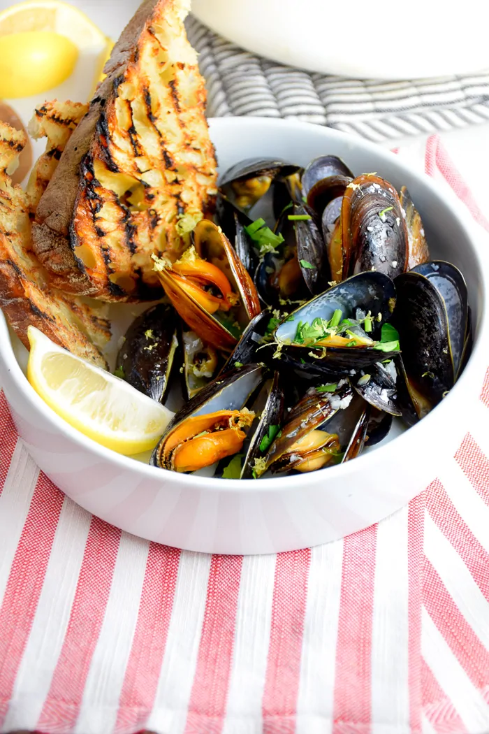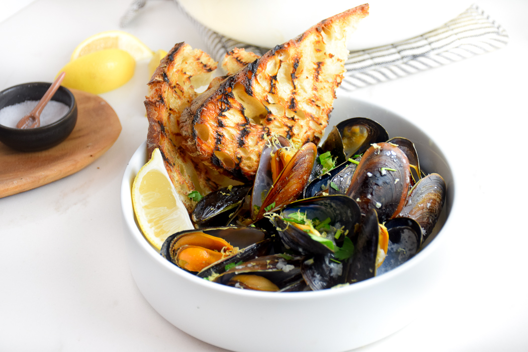 I love mussels many ways but one of my go-to ways to cook them is in a white wine garlic butter sauce. I’m drooling just a little bit thinking about it. This recipe is so easy, it’s actually really difficult to mess it up. Plus, the sauce is so delicious and sops up easily with some toasted bread!