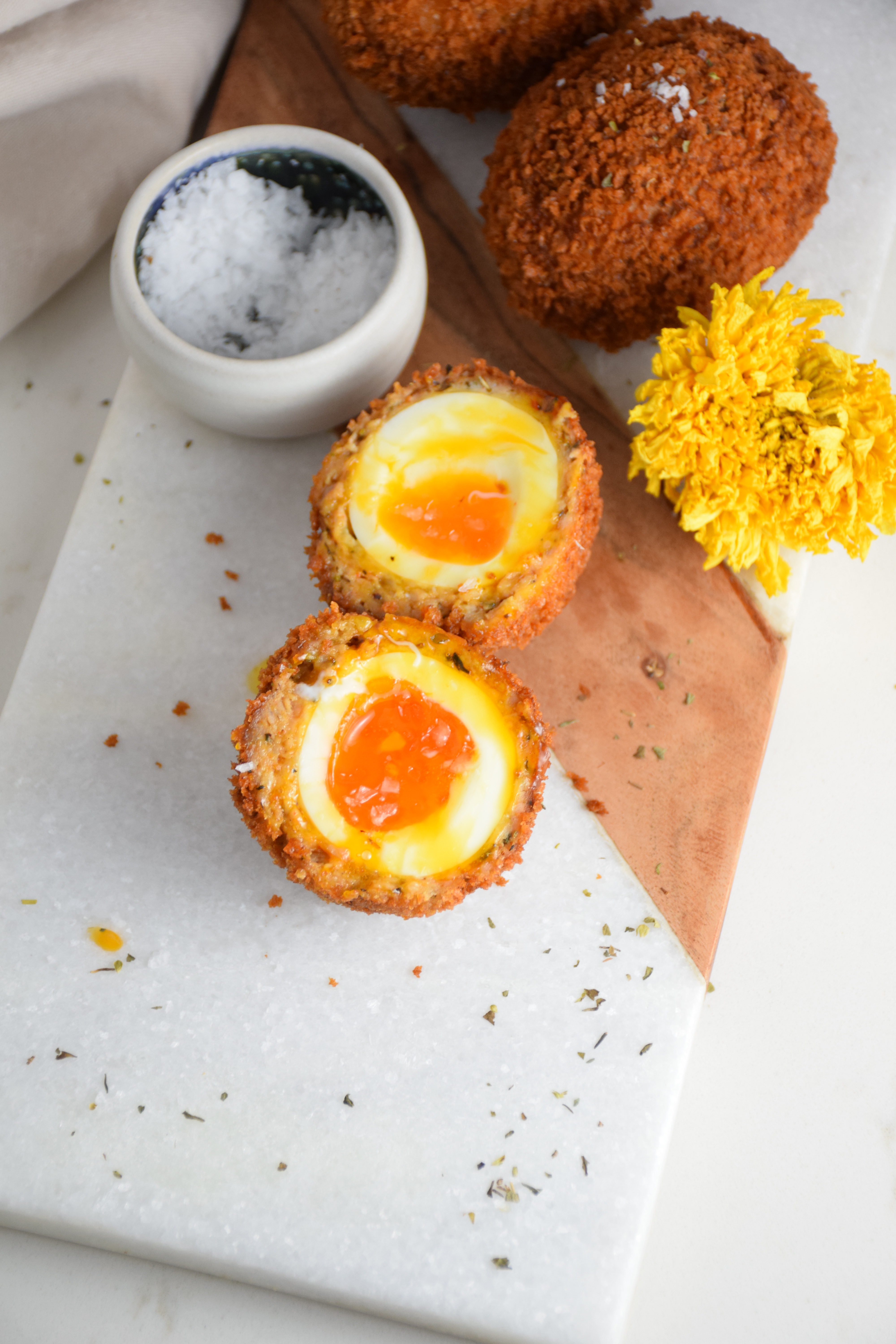 Scotch Eggs are usually served cut in half or fourths, totally up to you. I find that halved are better, especially if you prefer a runnier yolk. These are also a savory and warm alternative to deviled eggs! The sausage and fried breadcrumbs really add tons of extra flavor.