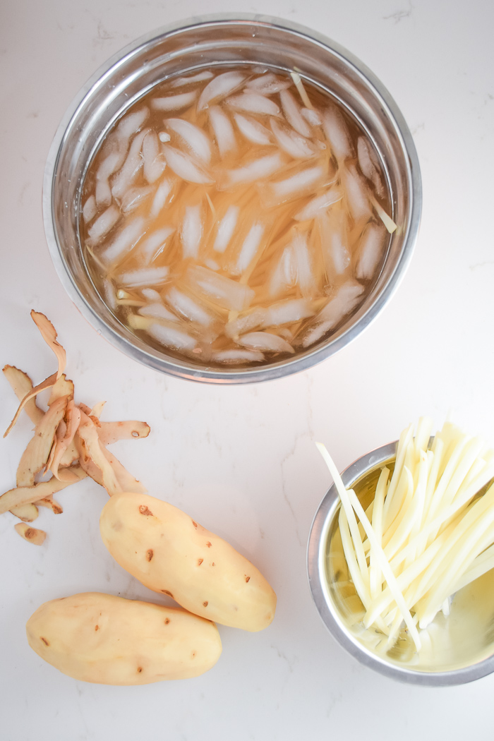 - Place the sliced, uncooked fries into a large bowl. Cover with ice and fill with water. Let the potatoes chill in the water for at least 30min or up to an hour.