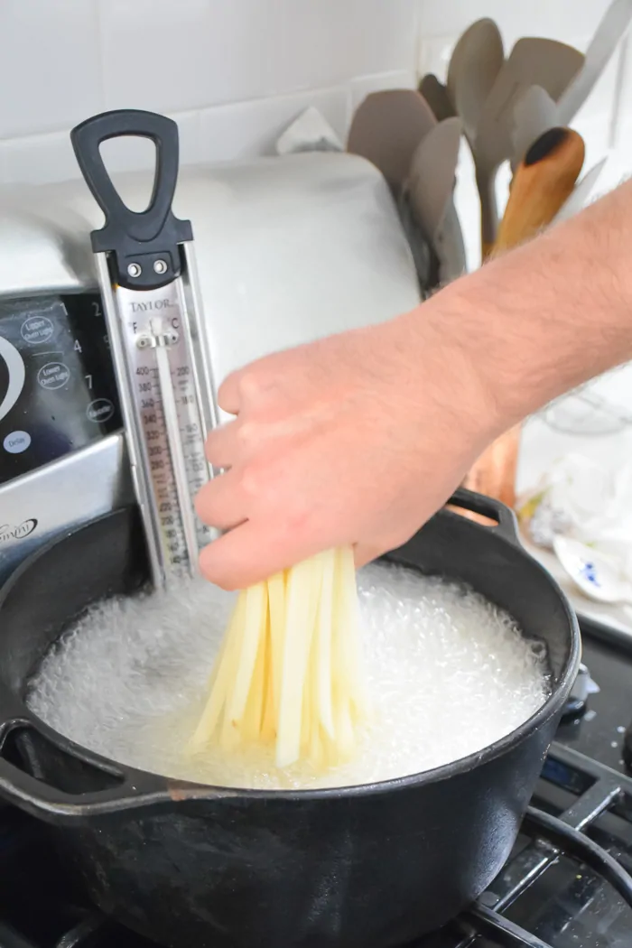 Step 5: Remove fries from water and pat dry. Then carefully place into the pot. Depending on the size and depth of your pot, you might need to fry the potatoes in batches. Do not stir the fries once they are in the oil. Let them sit, if you stir, there is a good chance you will break the fries. Let the fries cook until they are slightly lighter than the color of a McDonald’s french fry. The timing really depends on several factors like quantity of oil and potatoes, size of pot, etc. so timing is difficult to measure here but it seems to be in about the 10 minute range for us.
