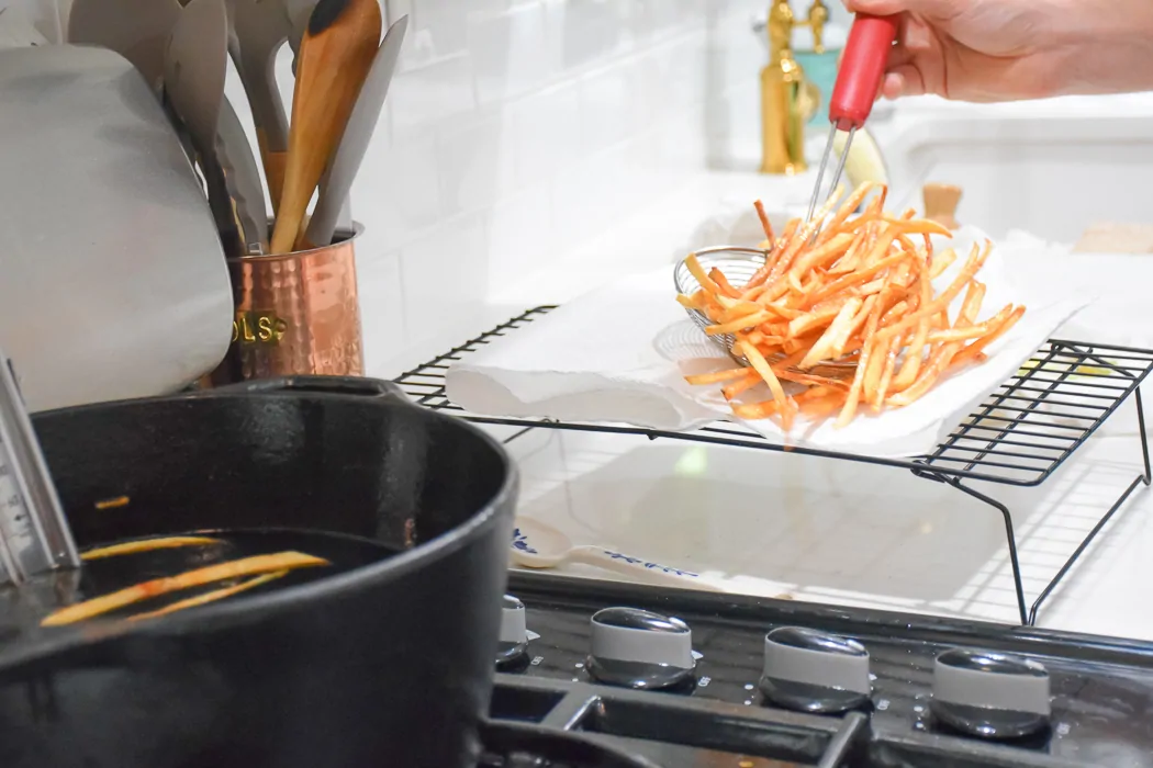 Step 7: Wait to this second fry until you are ready to serve the fries. The first fry can be done ahead of time, up to an hour, then do the second fry right before serving. Once the oil reaches 350 degrees F, return the fries to the pot for the double fry! Hello crispiness! Let fries fry for another 1-2 minutes or until golden. You’ll want to pull them out before they get too brown or they will be too crispy.