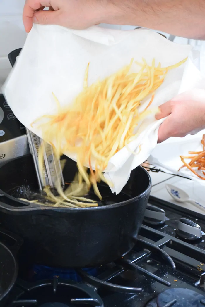 - Remove fries from water and pat dry. Then carefully place into the hot oil. Depending on the size and depth of your pot, you might need to fry the potatoes in batches. Do not stir the fries once they are in the oil. Let them sit, if you stir, there is a good chance you will break the fries. Let the fries cook until they are slightly lighter than the color of a McDonald’s french fry. The timing really depends on several factors like quantity of oil and potatoes, size of pot, etc. so timing is difficult to measure here.