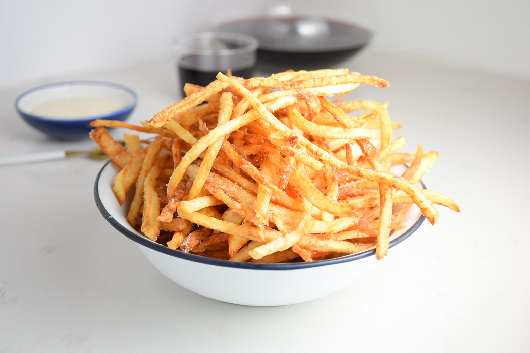 I’ve tried making oven baked french fries before and while they are delicious, they aren’t quite that restaurant crispiness that has me running to happy hour. After a few tries at home, BMW and I have nailed down the recipe and tips that you need to know to make the BEST french fries at home! These will rival any restaurant french fries and you don’t even have to put on pants.