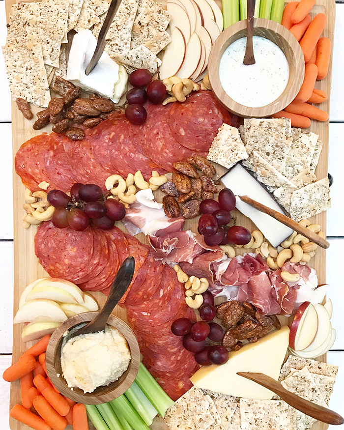 - Make the board look full by spreading out the meats and cheese and filling in with the other accoutrements like fruit and veggies, nuts – both candied and salty, olives, and dips like hummus or ranch dressing