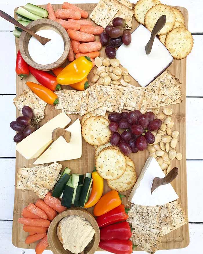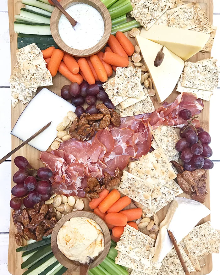 For this cheese board, I added veggies like carrots and celery and had hummus and homemade ranch dressing for dipping!
