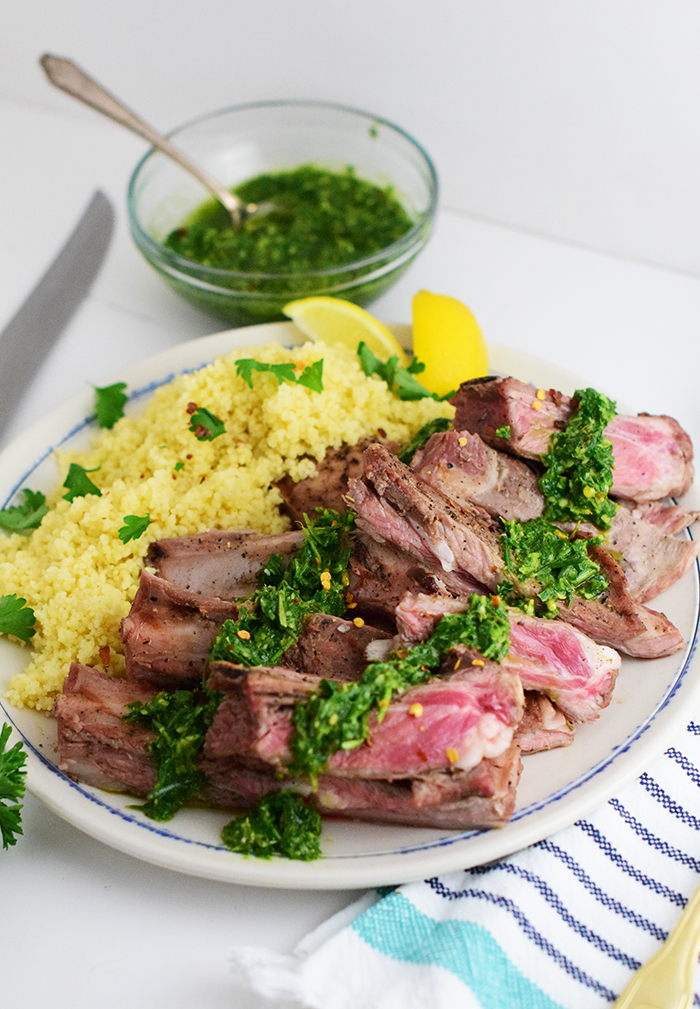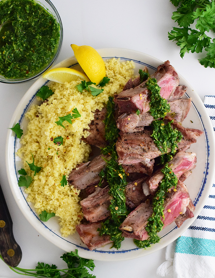 - Drizzle cooked lamb with chimichurri and enjoy! I served this with couscous and it paired nicely soaking up all the flavorful juices!