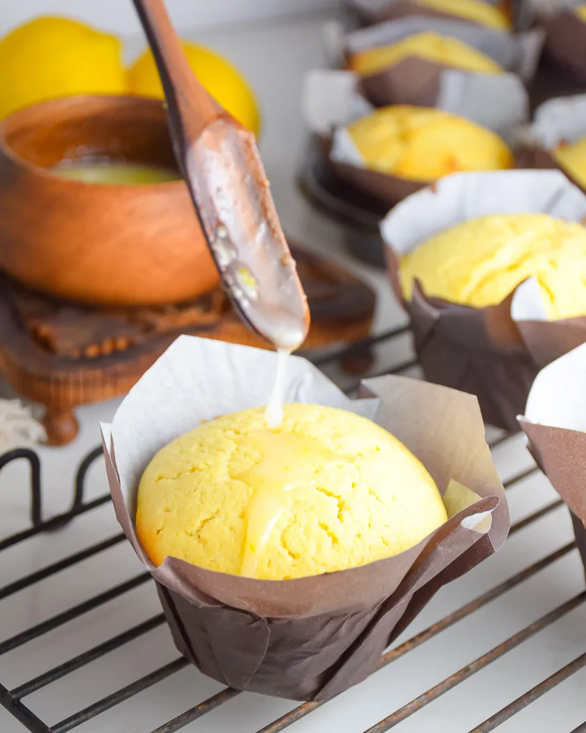 - While muffins are baking, make the glaze by whisking the powdered sugar, lemon juice and zest until smooth.
