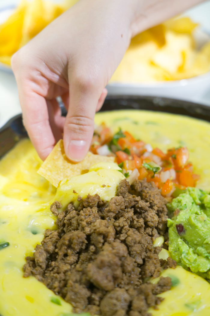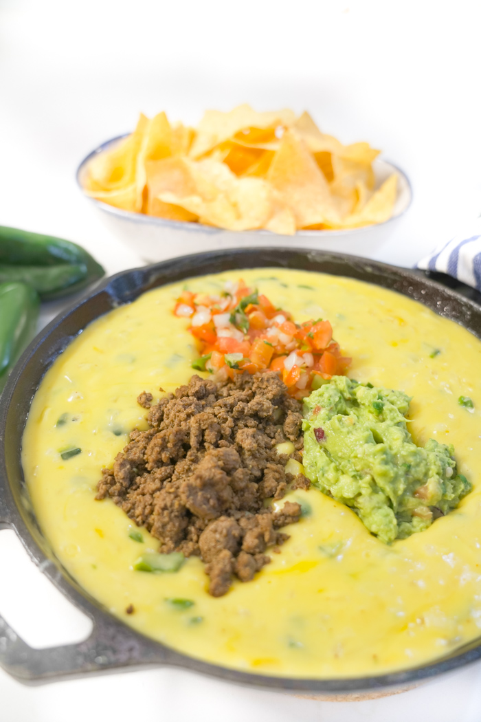When it comes to chowing down at home for watching games, this Loaded Tex-Mex Queso really hits the spot and it’s super easy to make! I love to make it in the skillet, just like the restaurants do, but you can easily make this in a crock pot if you want to keep it warm!
