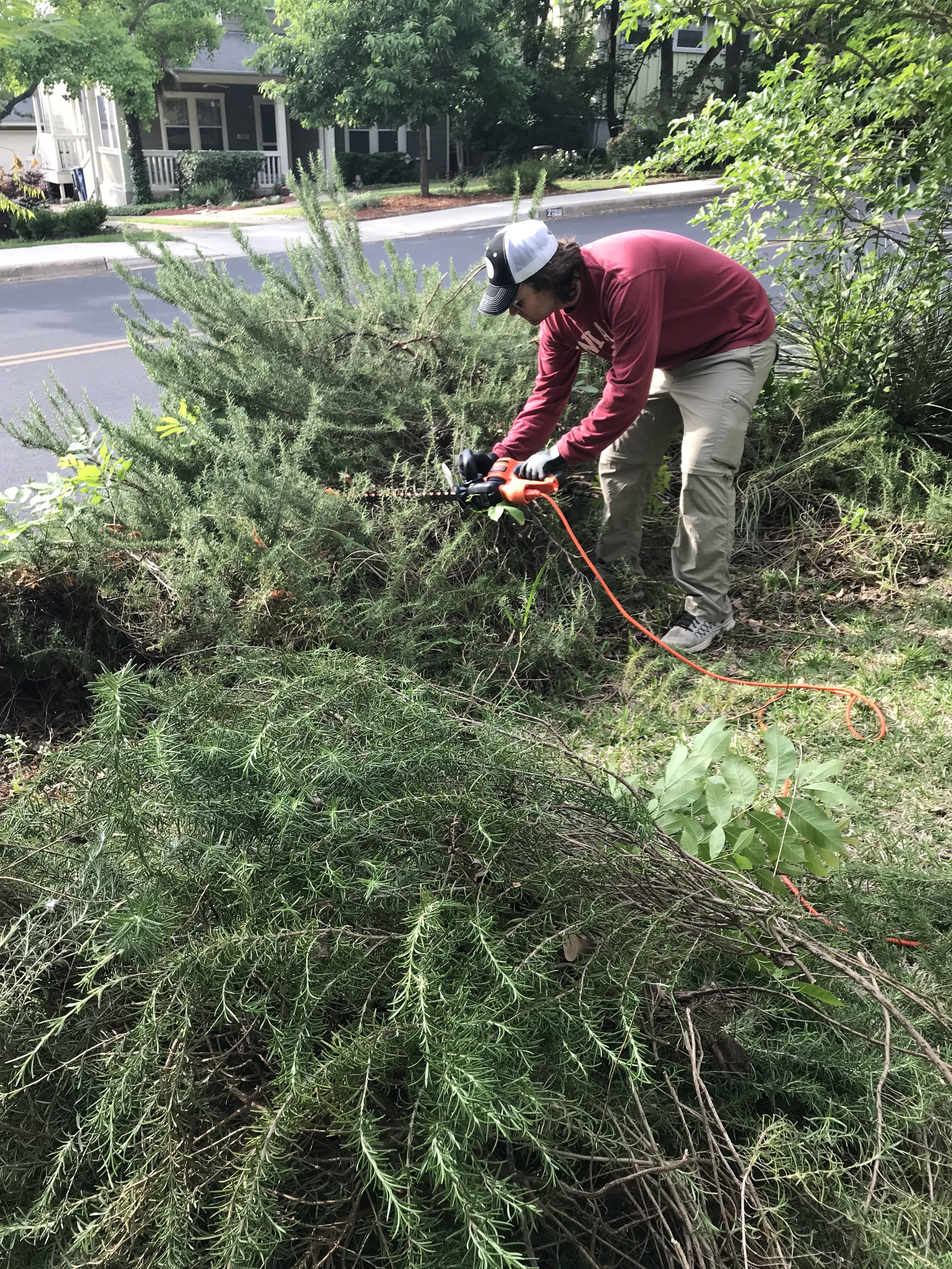 Step 1: We used a hedge trimmer to cut back the rosemary to the thick stalk underneath. We cut the rosemary into 3ft. sections and tied it into bundles with compostable garden twine and composted it!