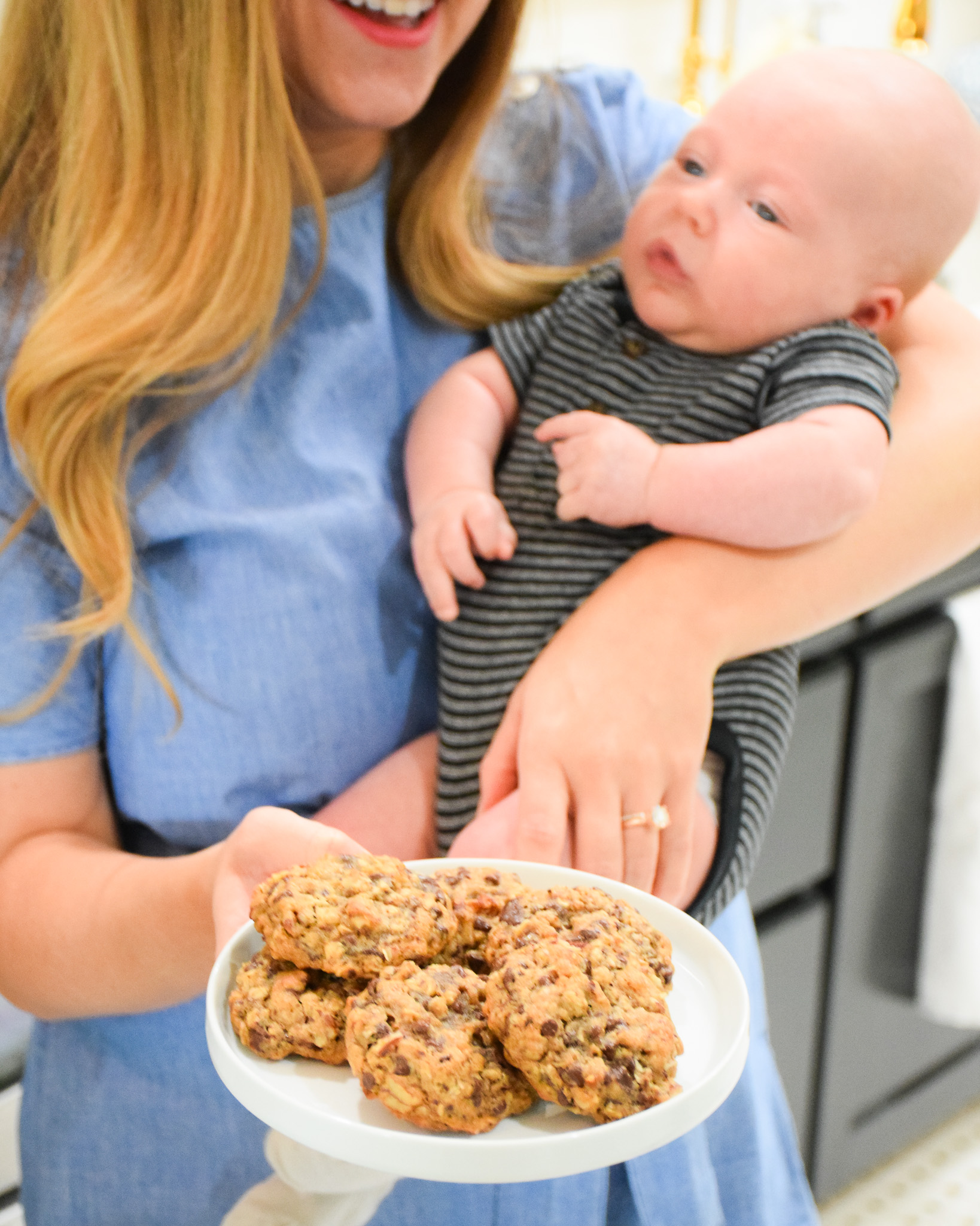 Ever since the arrival of Warren, I have been all about the cookies! Before he was born, I made a big batch of these Mini Chocolate Chip Cookies and froze them so I could pop a few into the oven and have a warm chocolate chip cookie whenever I wanted. However, after he arrived and I started breastfeeding, I was hangry. I was craving something a little sweet but wanted it to have some substance and balance. So BMW and I created this recipe for chocolate chip cookies that have milk production boosting oats and brewer’s yeast and pecans for some good fats and protein. And of course, these cookies are delicious!