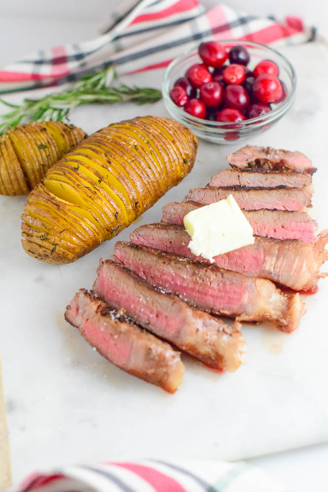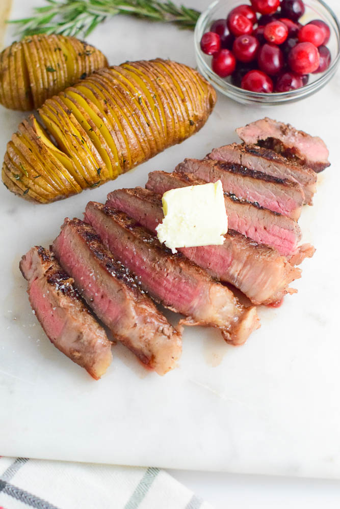 - Butter– Don’t be afraid to use butter and lots of it! Sizzle the butter in pan right before you put the steak in. Then add a little bit more. Using a big spoon to pour the melted butter over the steak as it is cooking. You might want to tilt the skillet to make this a little easier.