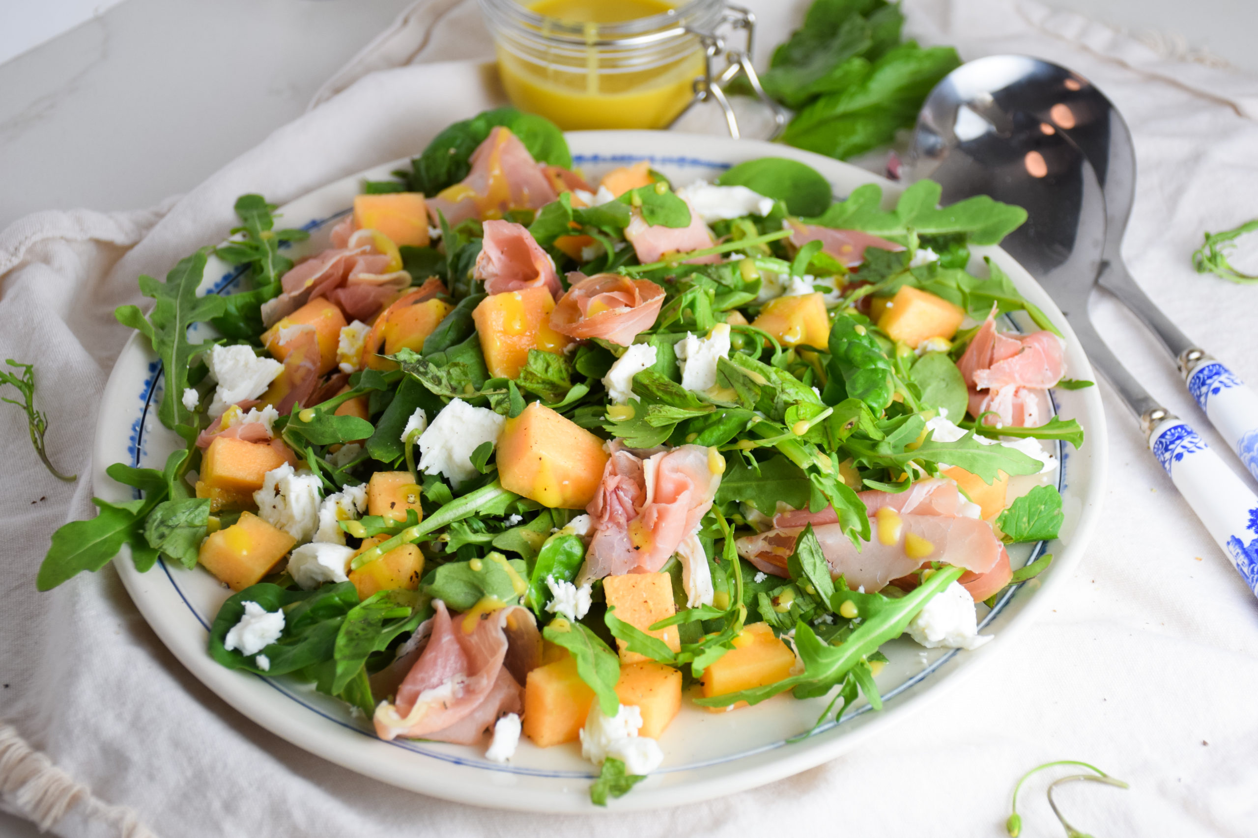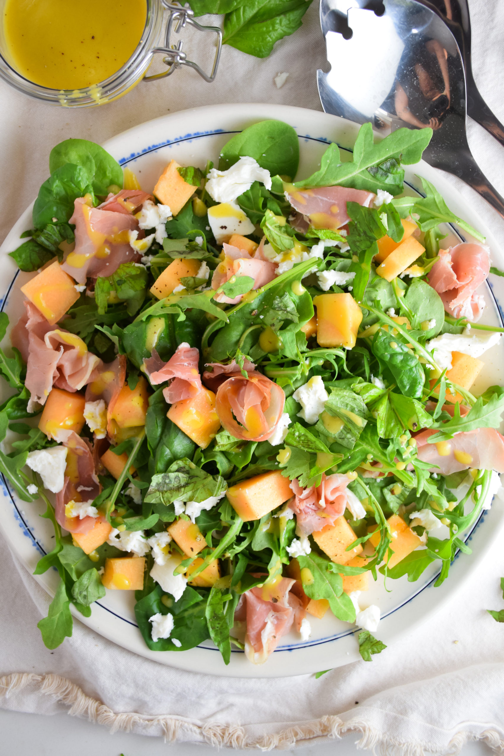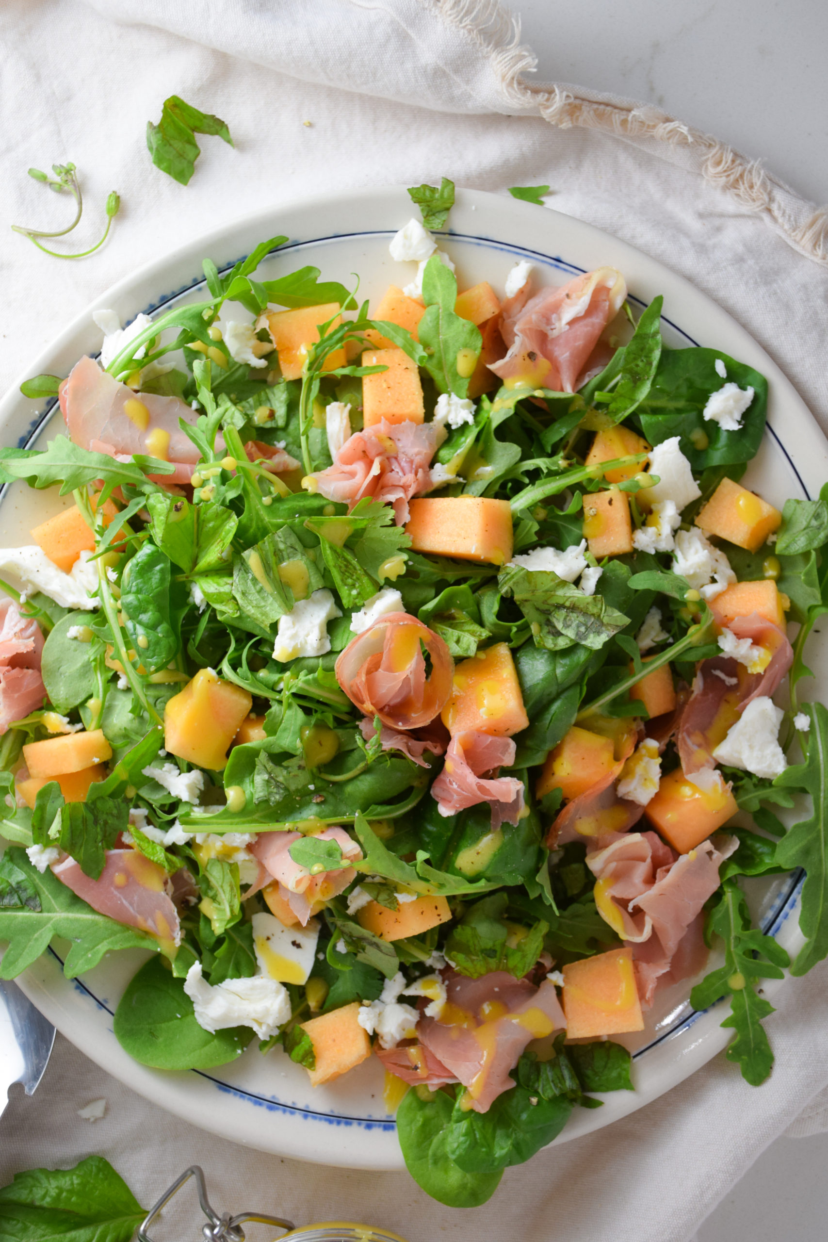 The salty prosciutto and creamy mozzarella really make the sweet, juicy cantaloupe come to life. The basil adds a little extra punch and the leafy greens like arugula add nice little herby kick. Basically, just a winner of a salad all around!