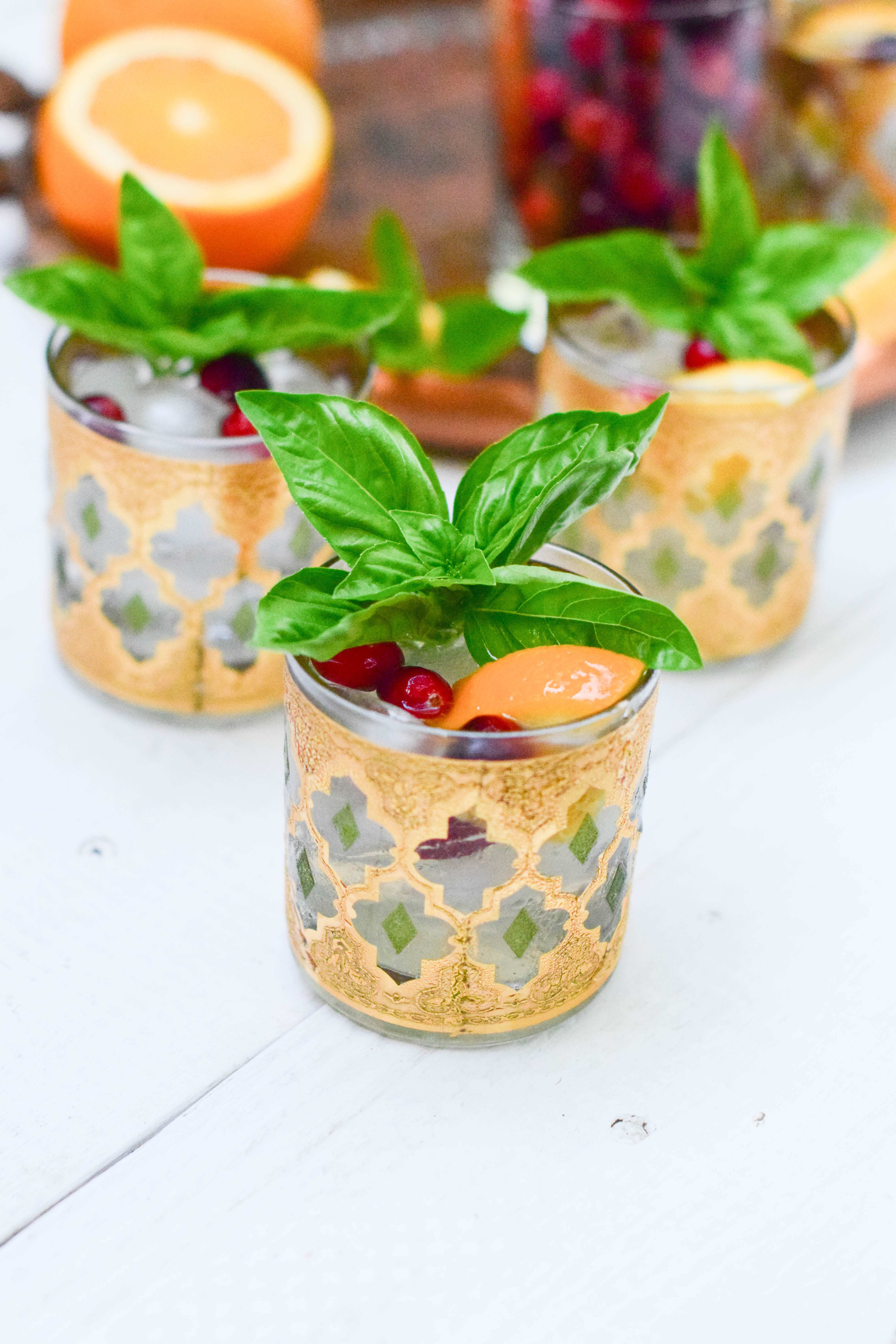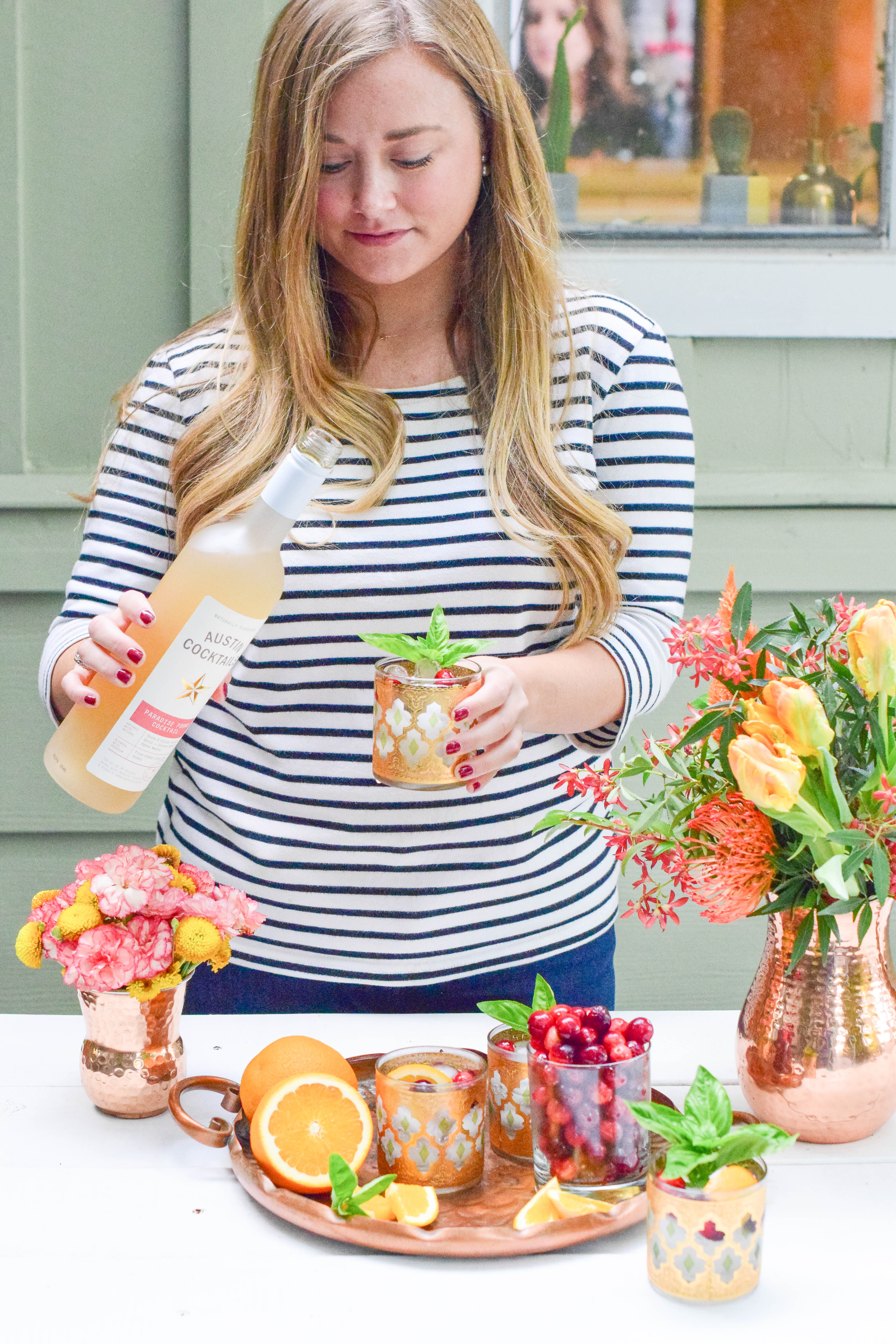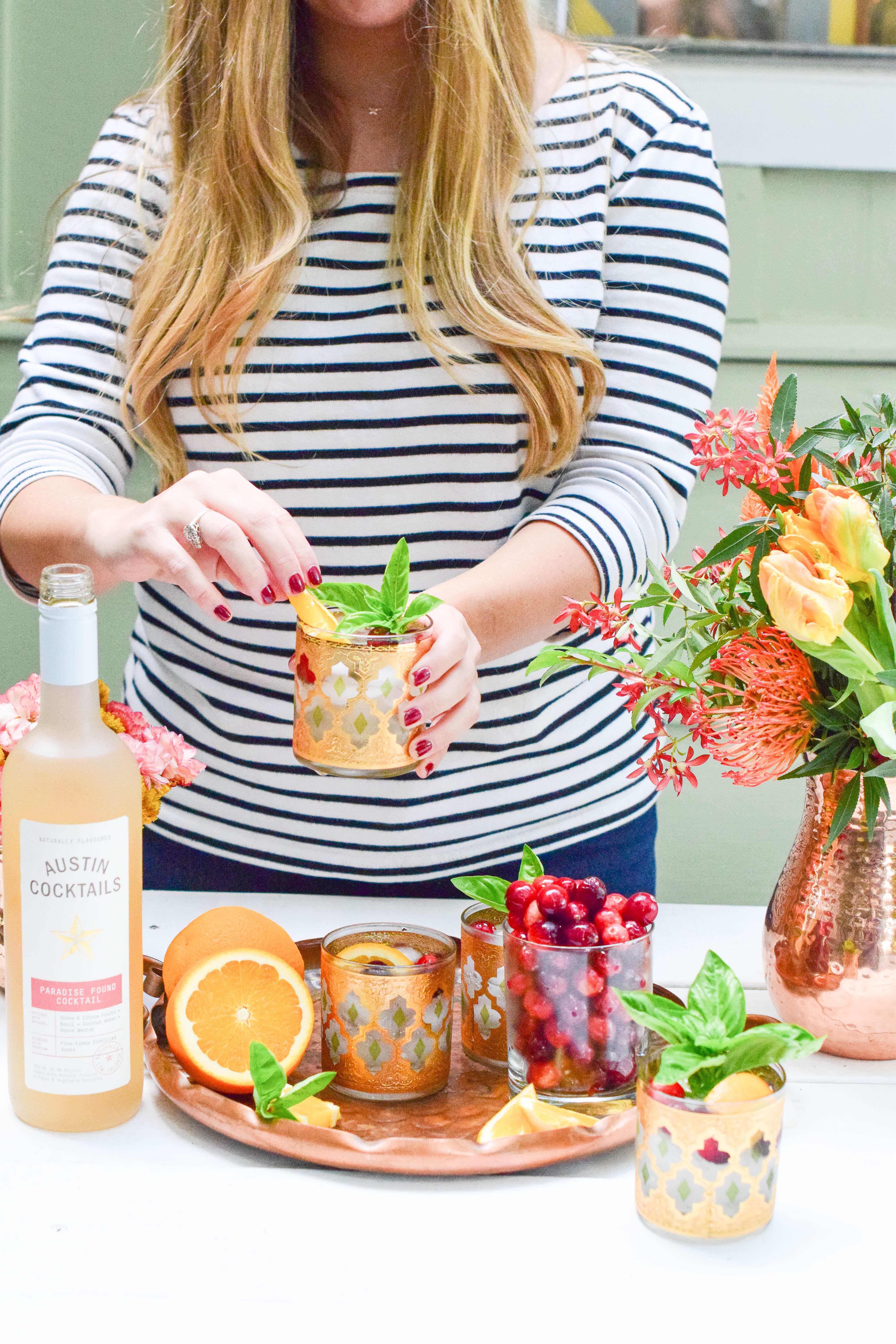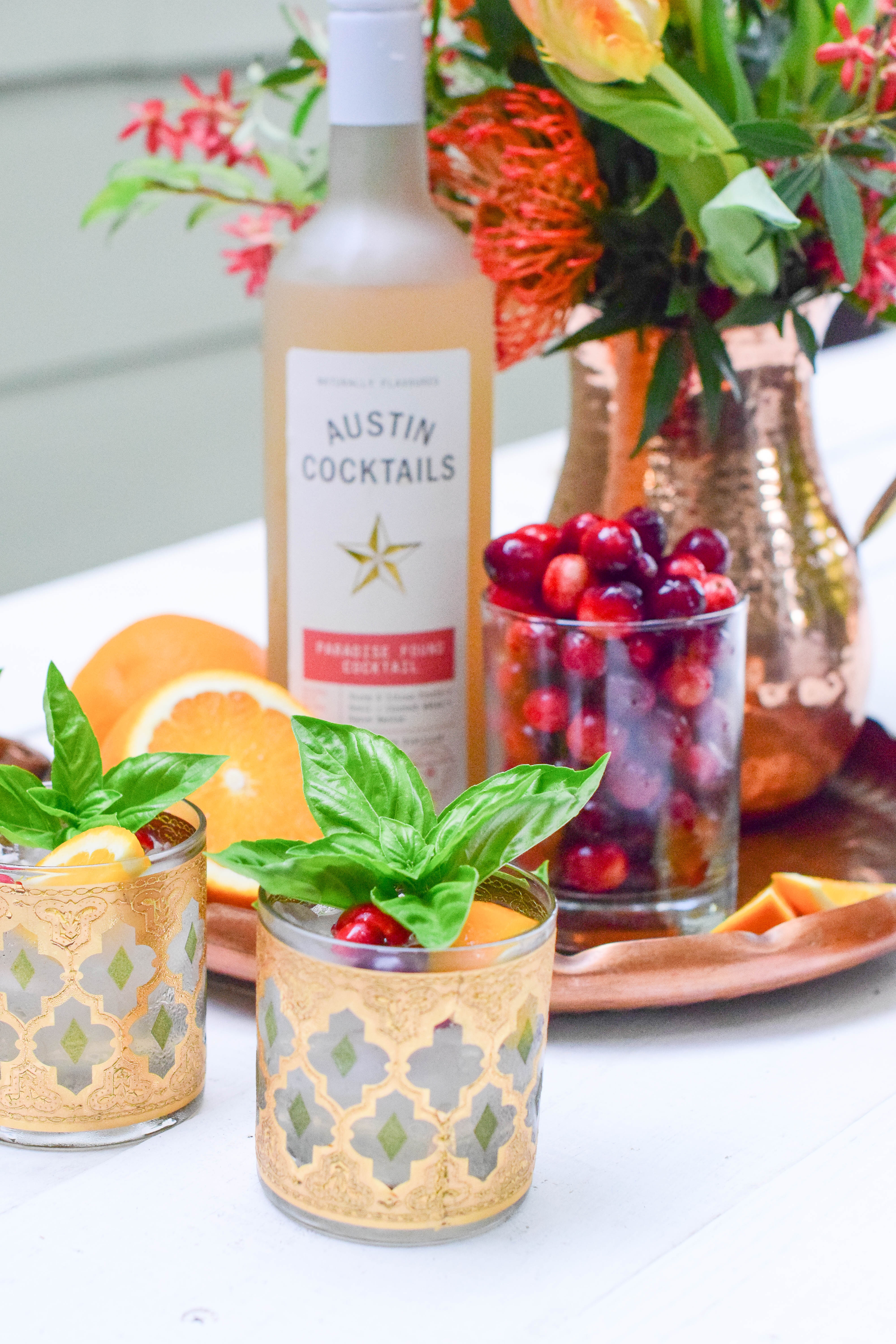 I whipped up these cocktails in no time with Austin Cocktail’s Paradise Found! It’s got a citrus kick with some agave and basil for sweetness. Since it still feels like summer in Austin right now, I picked some fresh basil from my garden for garnish. I threw in some orange slices and cranberries for a seasonally flair and topped it all off with a few splashes of sparkling water.