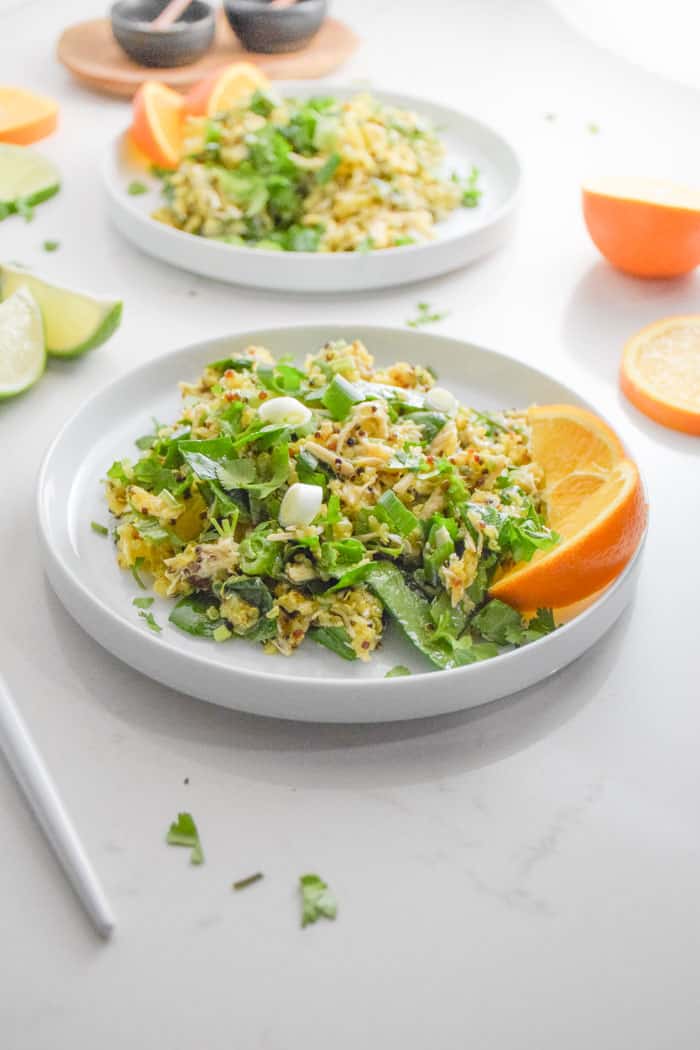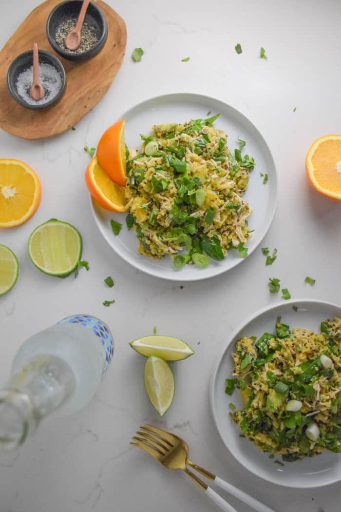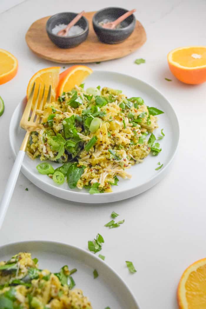 Sometimes I ask myself, how can I make this meal even better for not just my tastebuds but my body too. In this case, I added turmeric to the quinoa and spinach to the salad. Both are packed with antioxidants and powerful anti-inflammatory nutrients. The quinoa and chicken will keep you full and the bright orange juice is sweet and light at the same time!