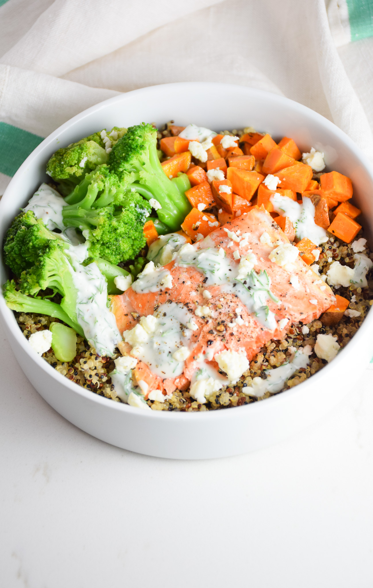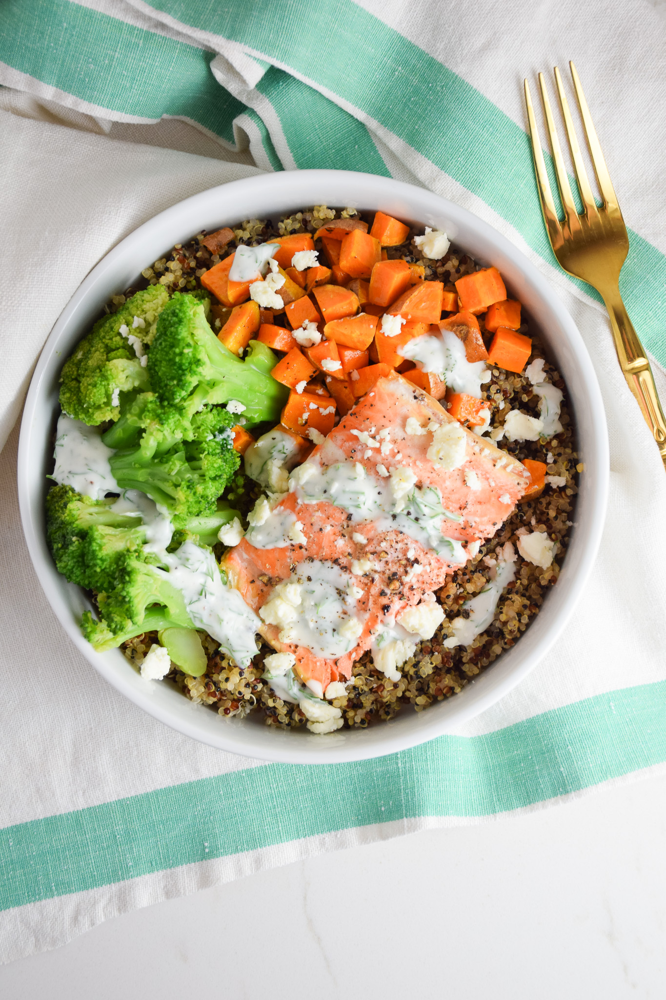 - Build buddha bowls by placing quinoa into bowls, adding veggies, then topping with salmon, lemony dill sauce and sprinkle with feta.