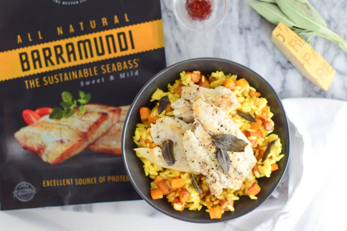I partnered with Australis Barramundi to create this recipe! I don’t always think of seafood as a comfort food or even a fall or winter food but actually lots of seafood is in season during the fall! Of course, Australis Barramundi is sustainably raised and caught and flash frozen so it’s always “in season!” The filets are hearty portions and when you seared them, I think they eat more like a chicken or meat than fish. Plus, what doesn’t taste great when paired with risotto?!
