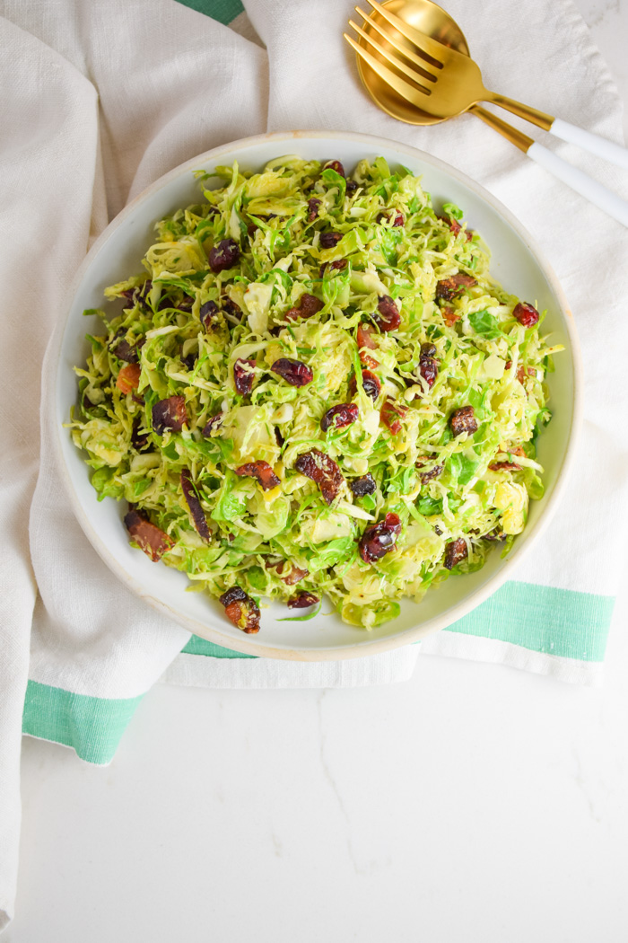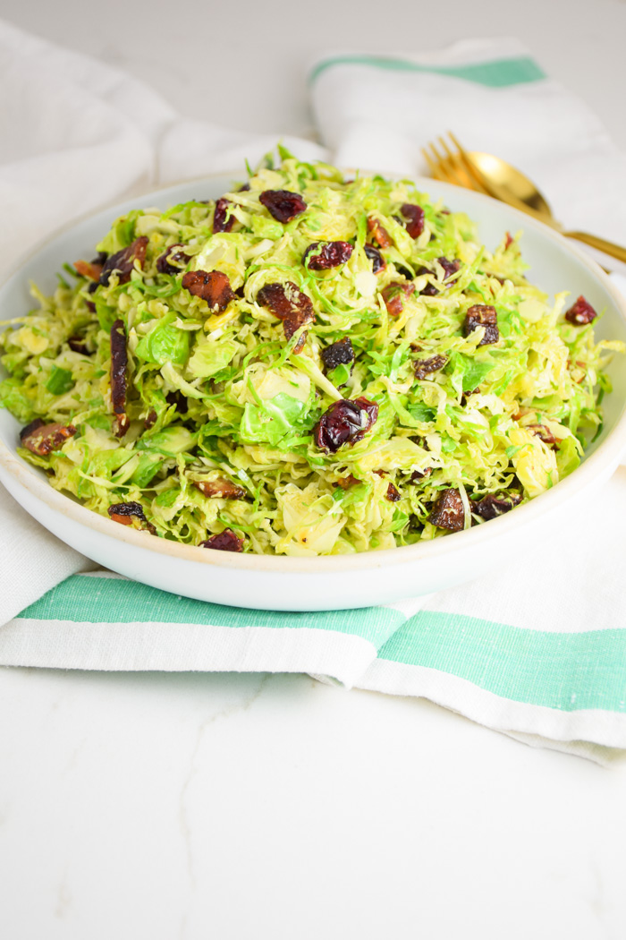 Shredded Brussels Sprout Salad with Bacon Lardons and Dried Cranberries is a quick and easy side or meal! It’s fresh and perfect anytime of year!