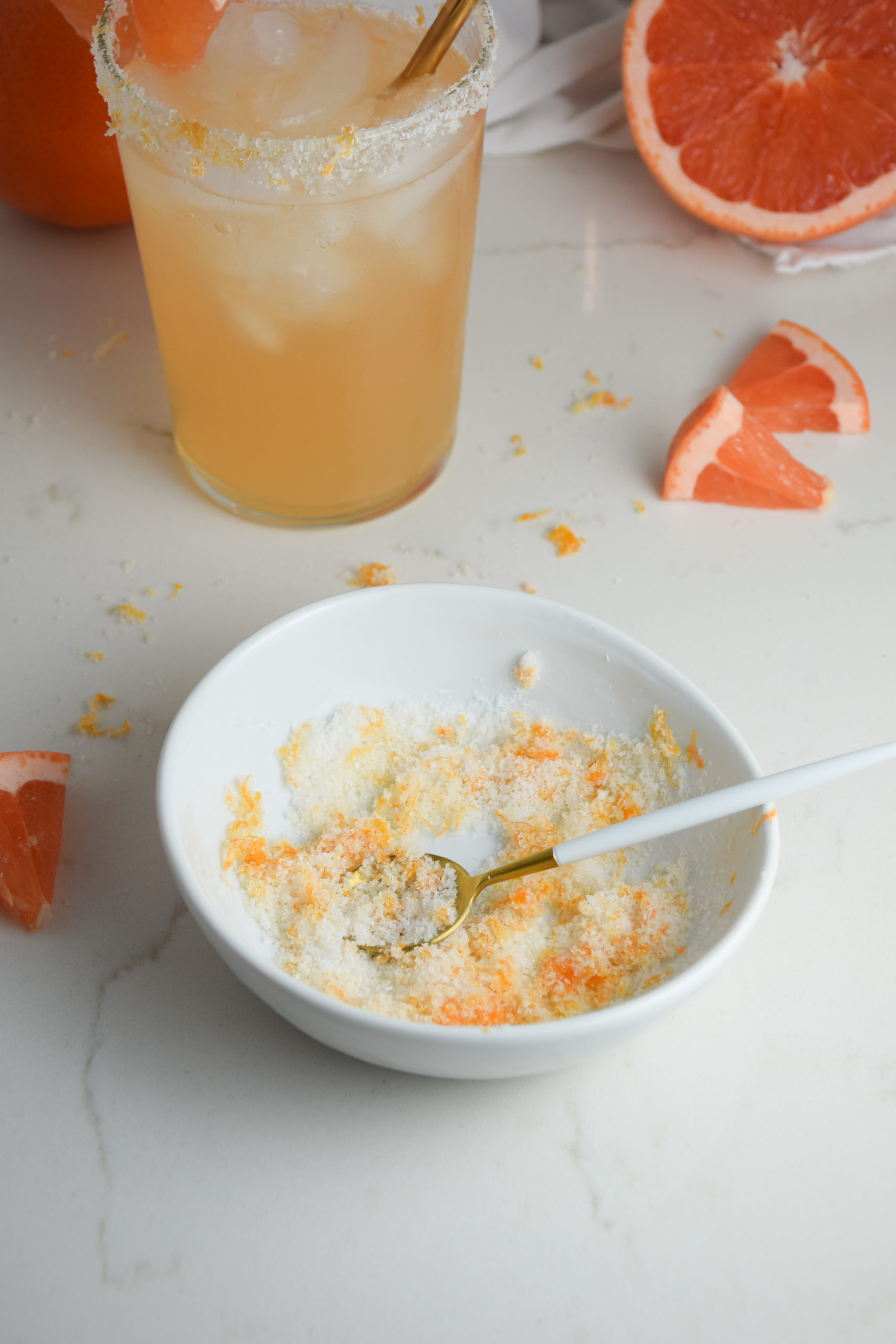 - In a shallow dish, pour an ounce or two of grapefruit juice. In another shallow dish, whisk together the sugar, salt and grapefruit zest.