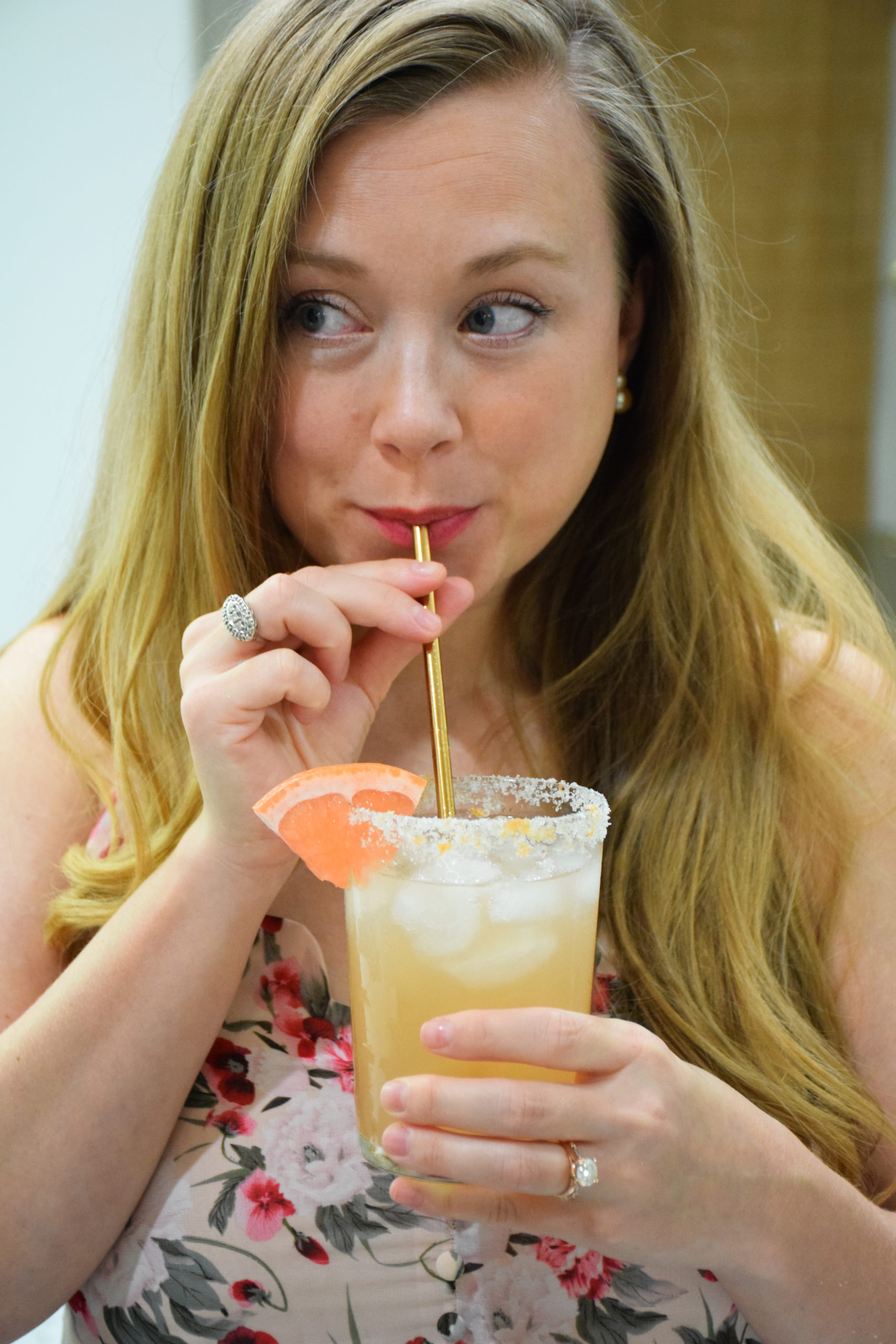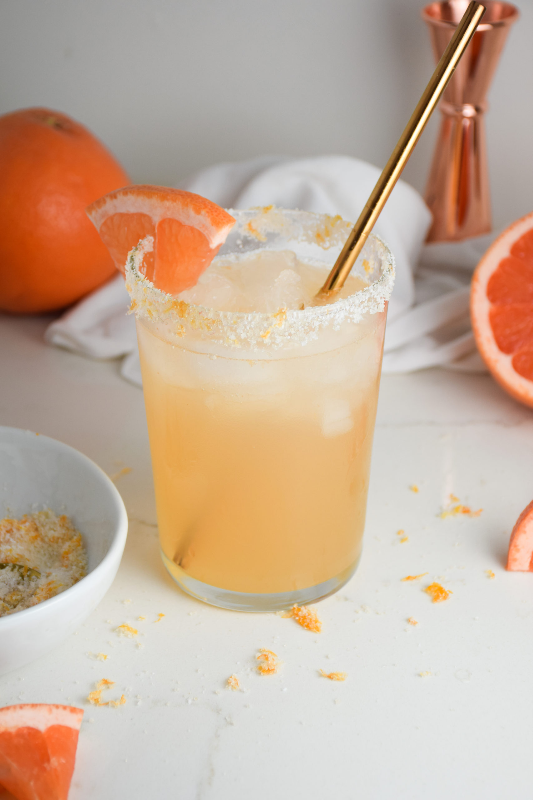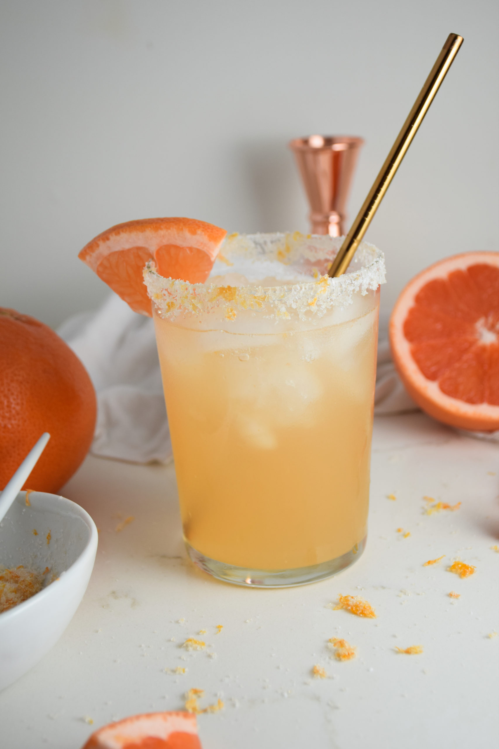 I would definitely recommend using a high quality clear tequila. A bad tequila will not be able to be covered up in this drink, so you’ll want to use the good stuff. Fresh grapefruit juice is a must in my opinion. Most grapefruits are quite juicy, so you shouldn’t have a problem there. The sugar salt rim is a little extra but I like making fancy cocktails at home!