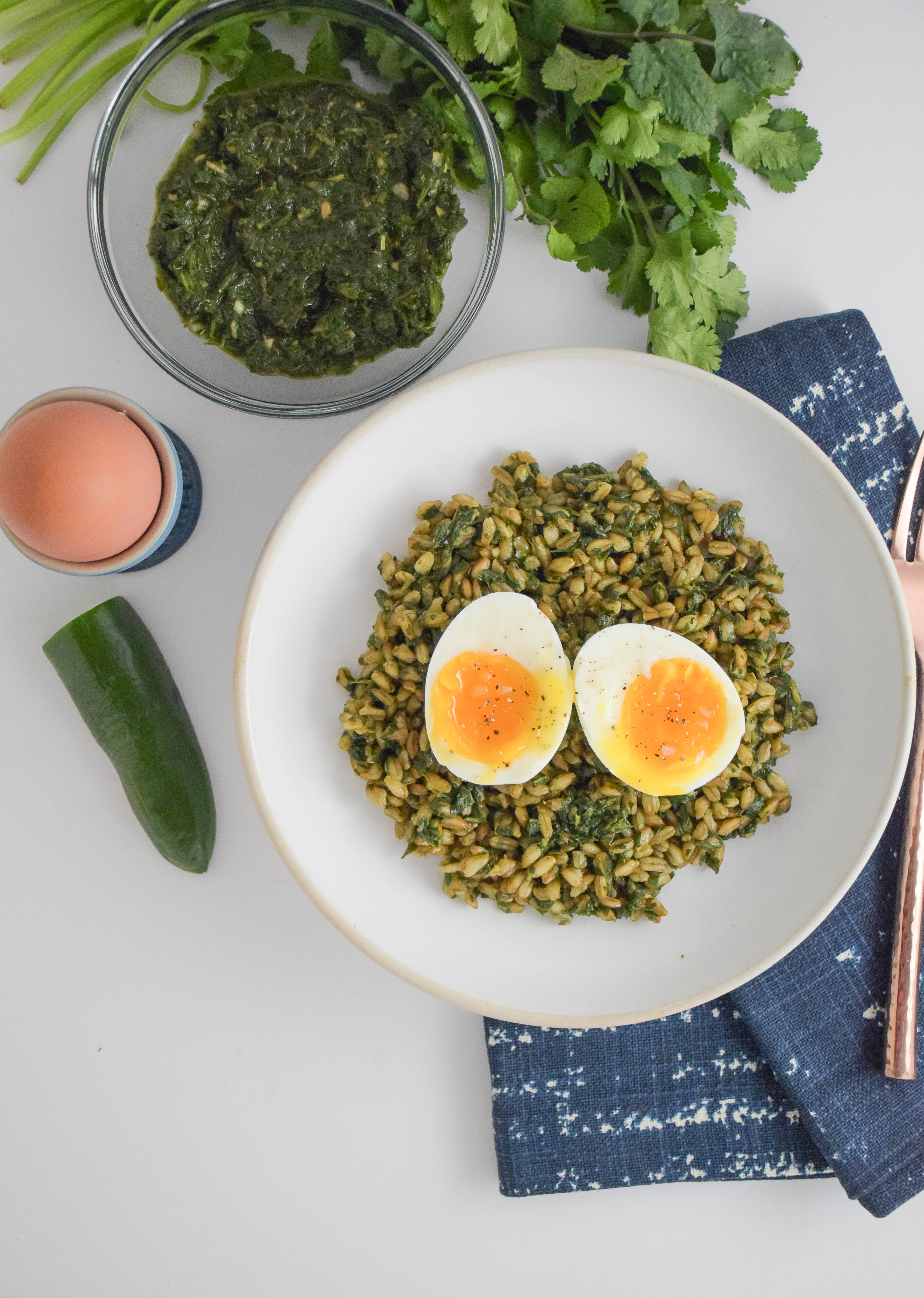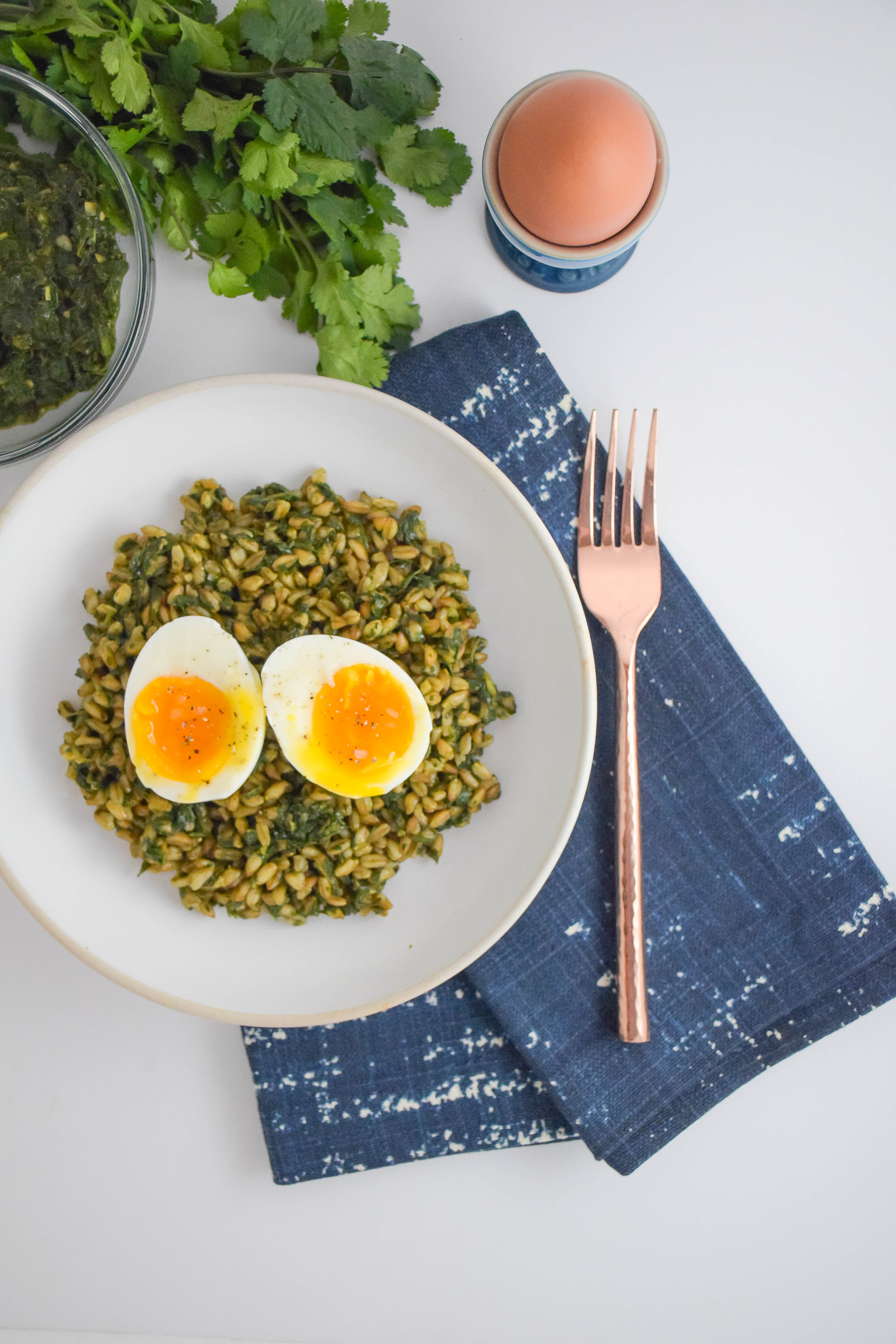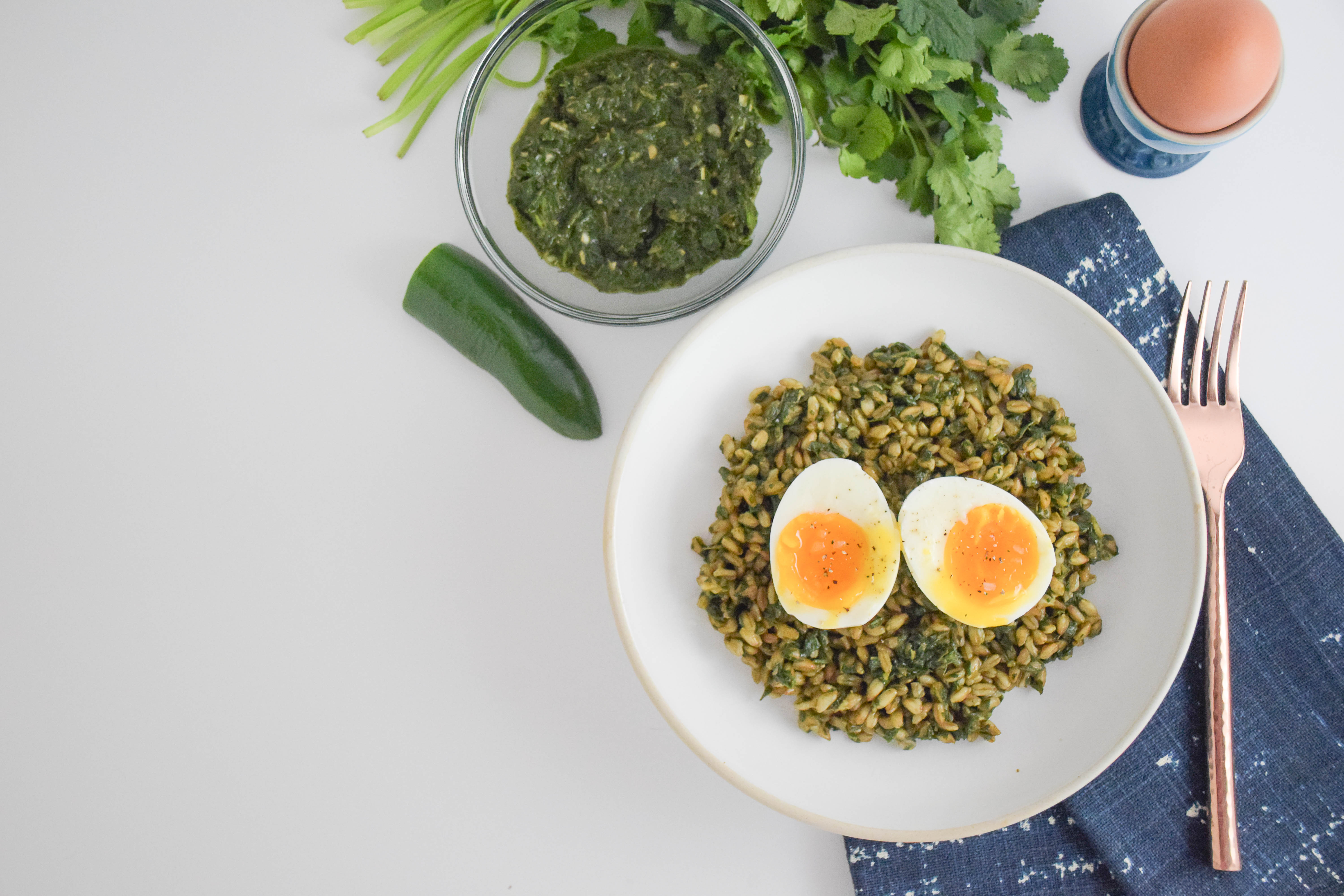 A variation of this dish has been something I’ve been eating for well, like the life of this blog! I love the bold flavors from the cilantro pesto and you can pair with just about anything from blood orange salad to potatoes and shrimp! I love adding an egg for extra protein. A soft boiled egg, like the one in this recipe, adds a creaminess and it takes less time– heyo! Win, win all around! You could add almost any protein to this dish though.