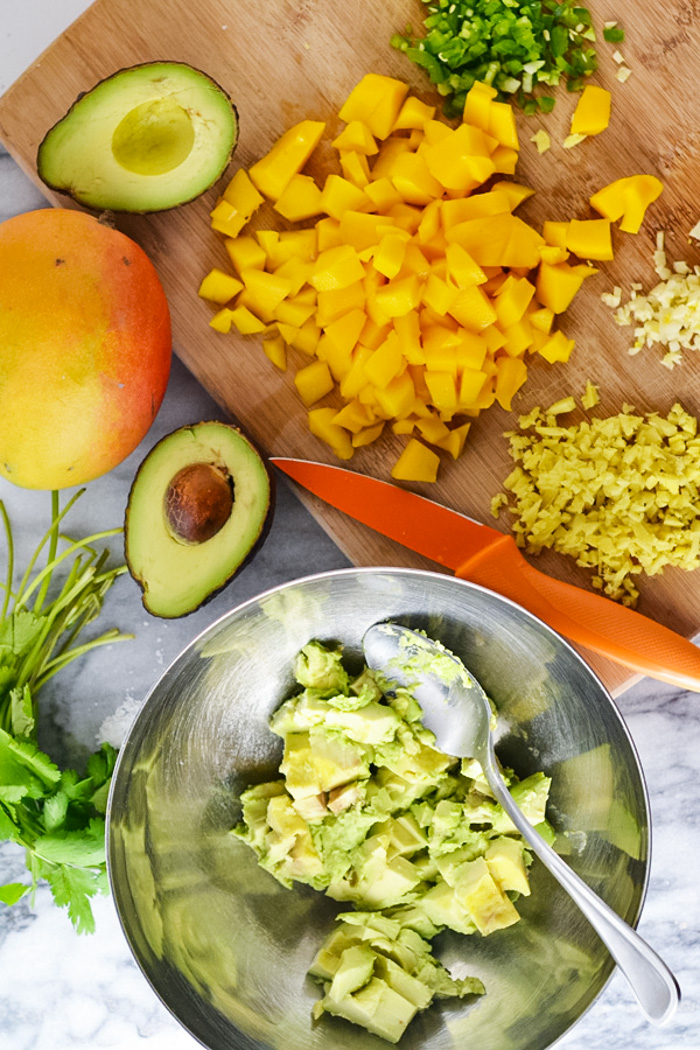The sweet mangoes balance the spicy heat of the combination of the ginger and jalapeño. Those two are a dynamic duo. The creamy avocado brings the earthiness needed to smooth it all together. And cilantro, because yeah. I like it almost as much as garlic, and garlic makes an appearance in this recipe too.