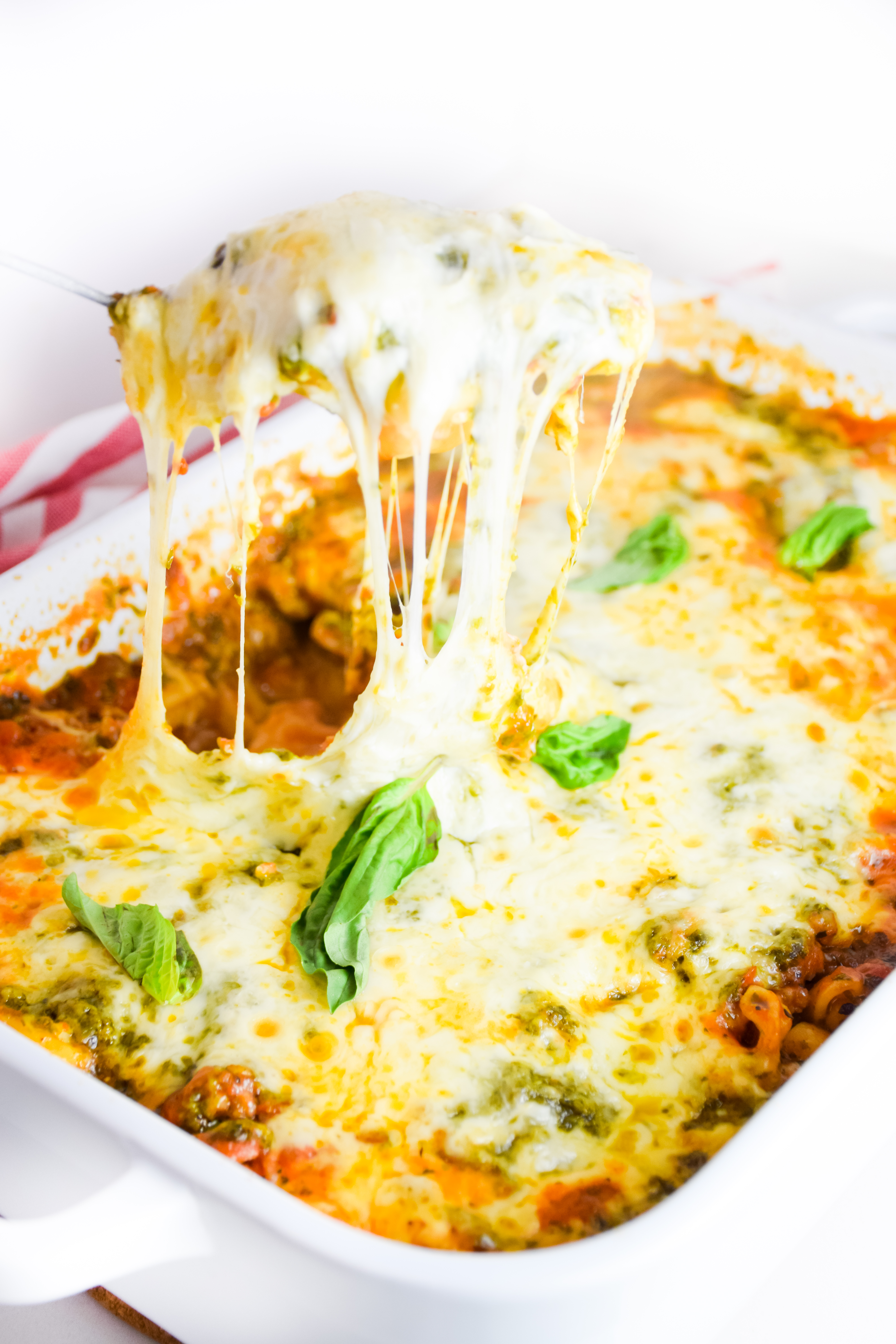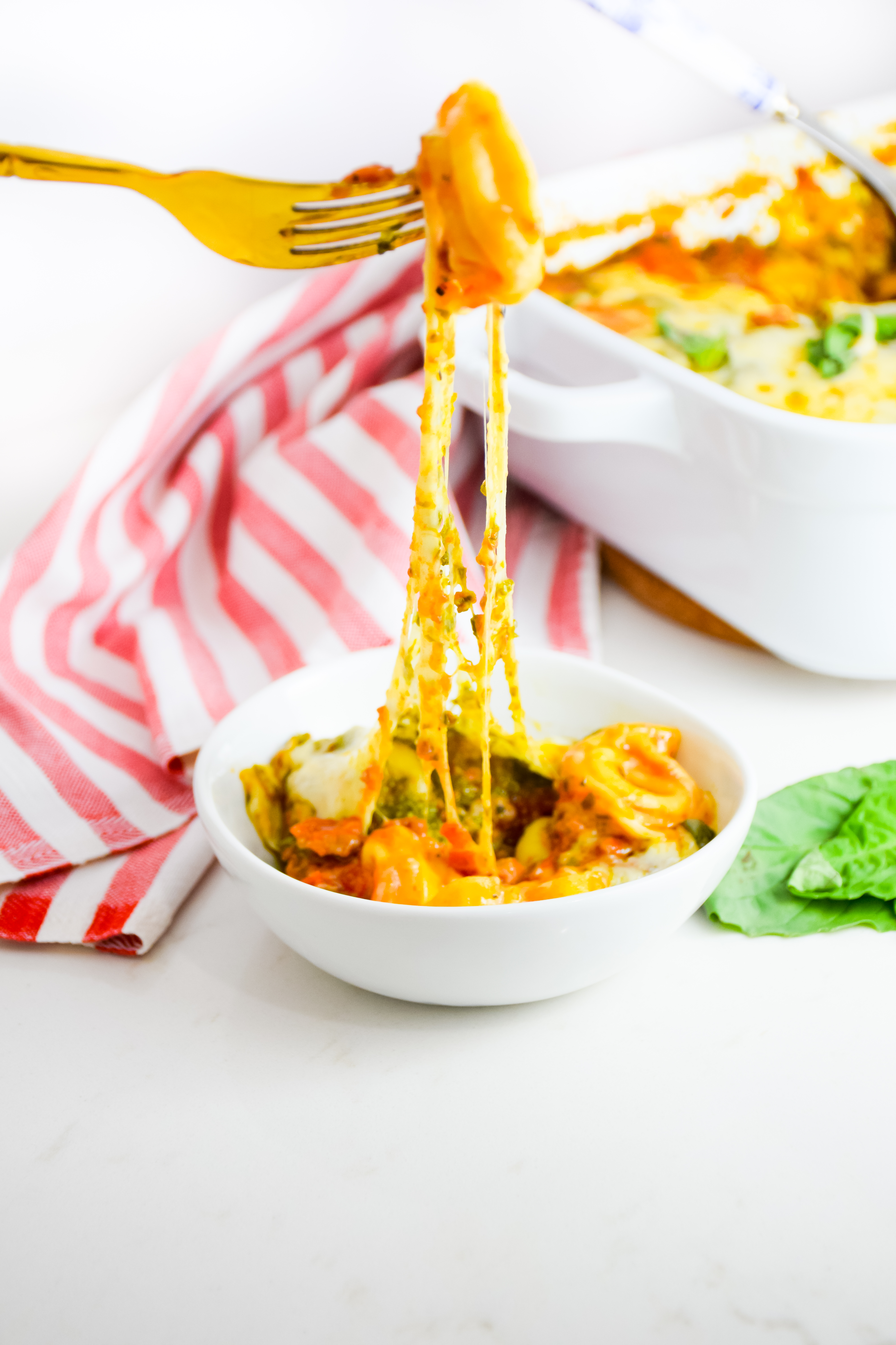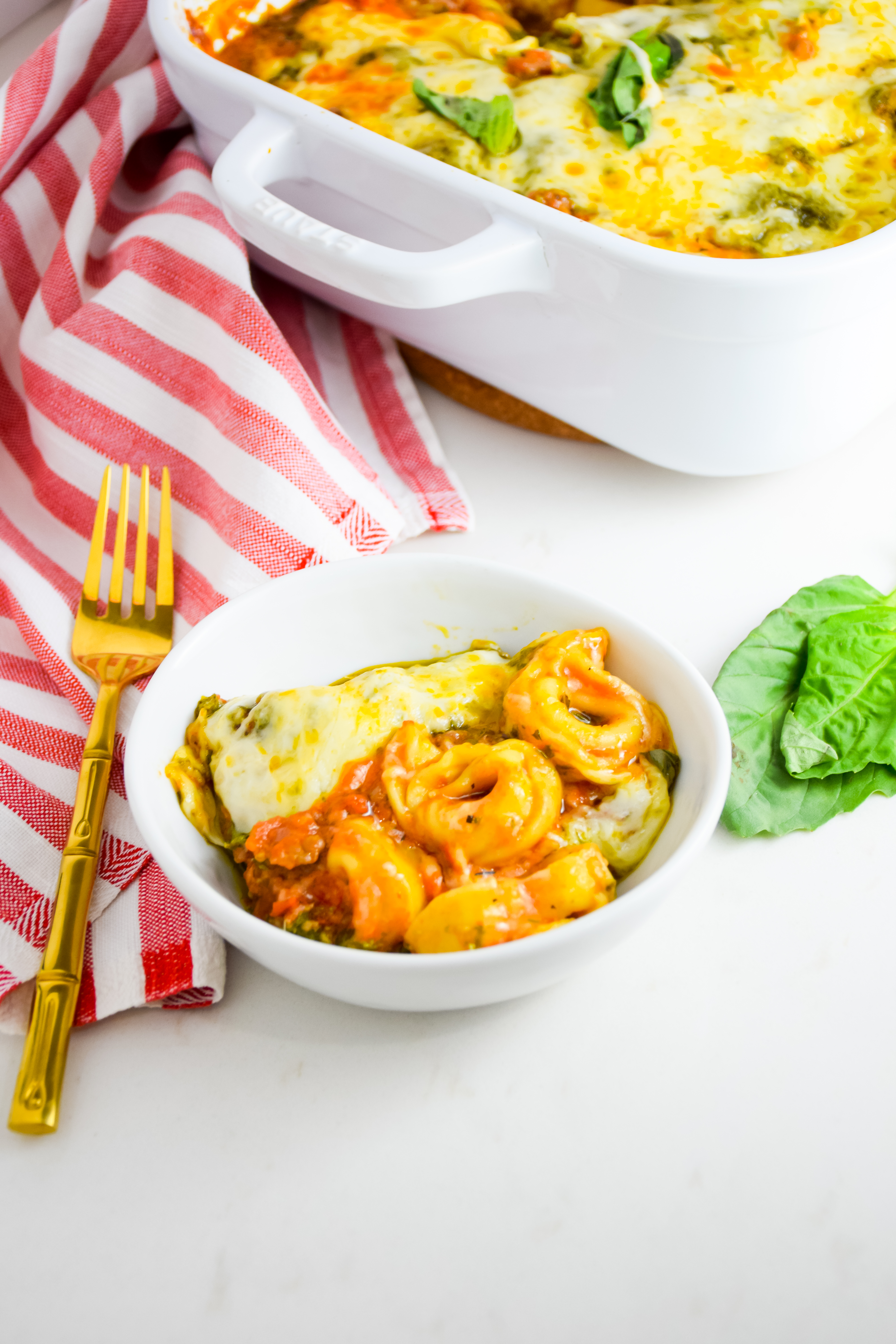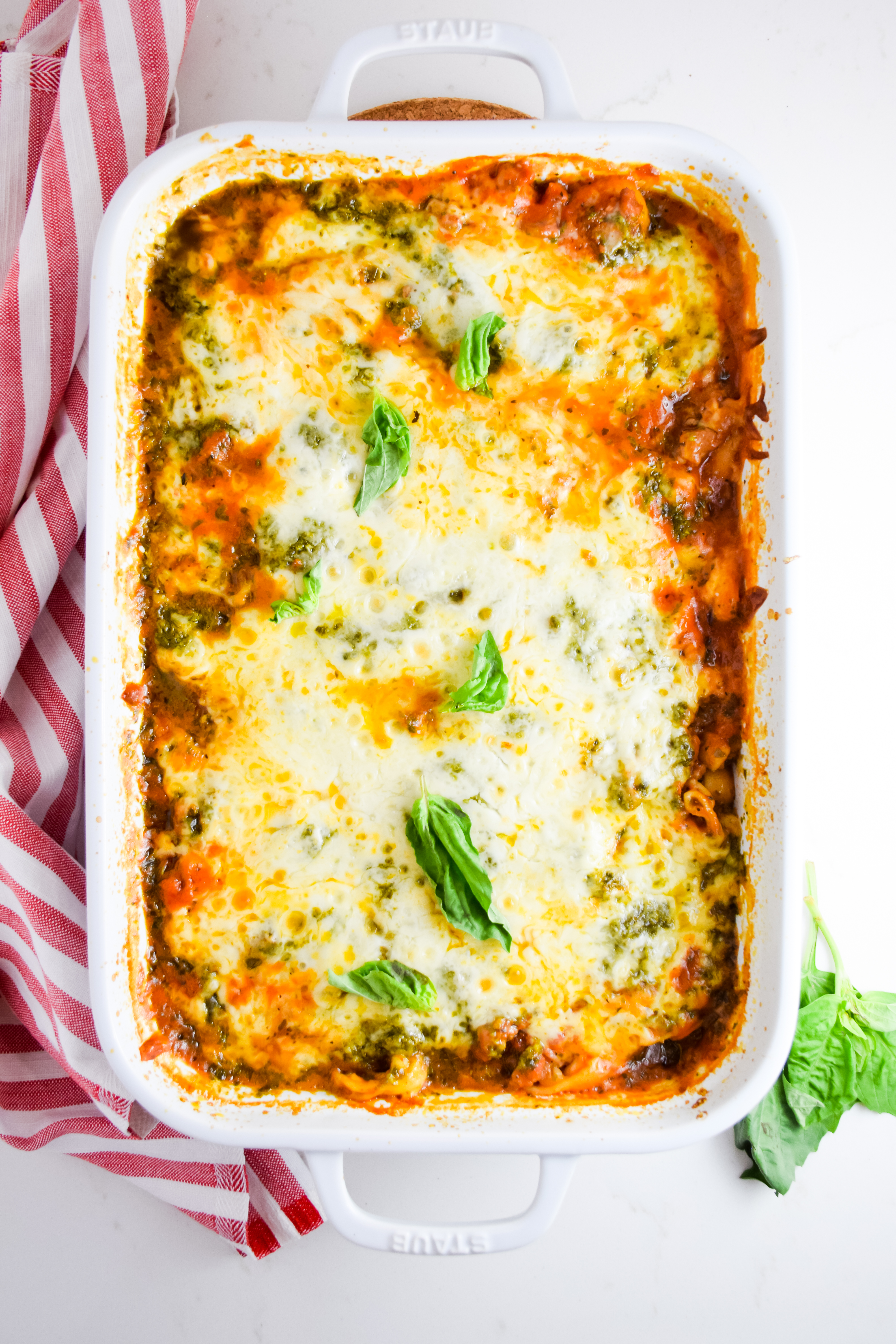There’s nothing more comforting than a big pan of this Spicy Red Sauce Pesto Tortellini Bake! It’s an easy make ahead meal that can feed a crowd!