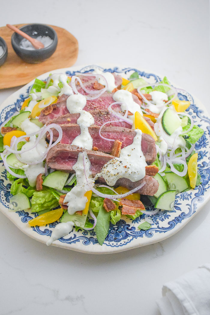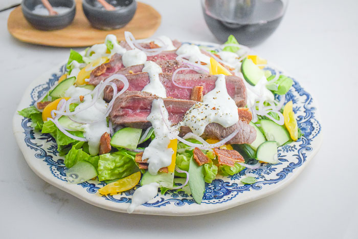 Steakhouse Salad with Blue Cheese Dressing is a bold and flavorful meal. Pair it with a glass of your favorite vino and make it a date night in!