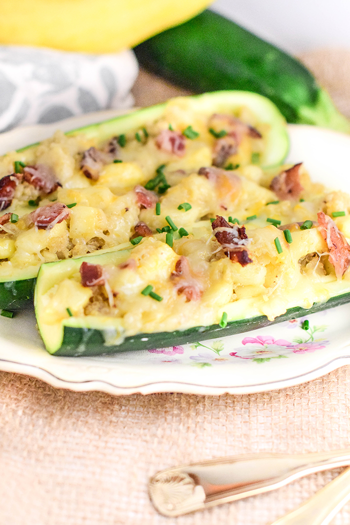 - Fill zucchini boats with mixture and top with crumbled bacon and cheese.