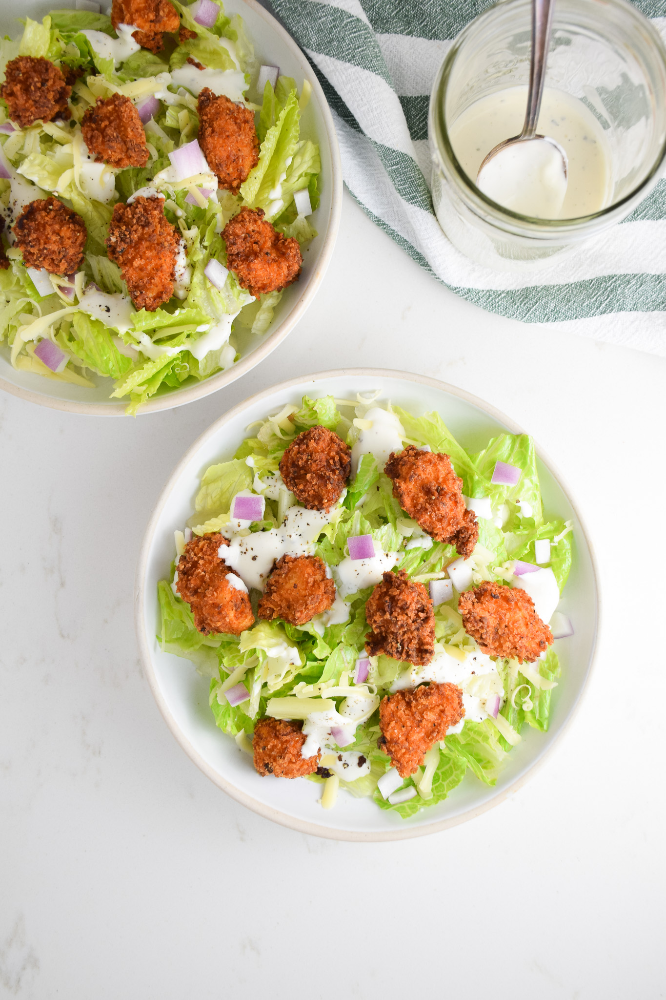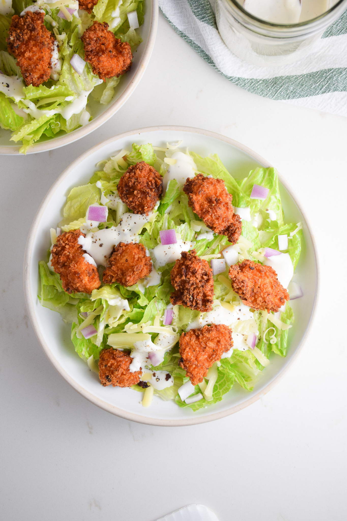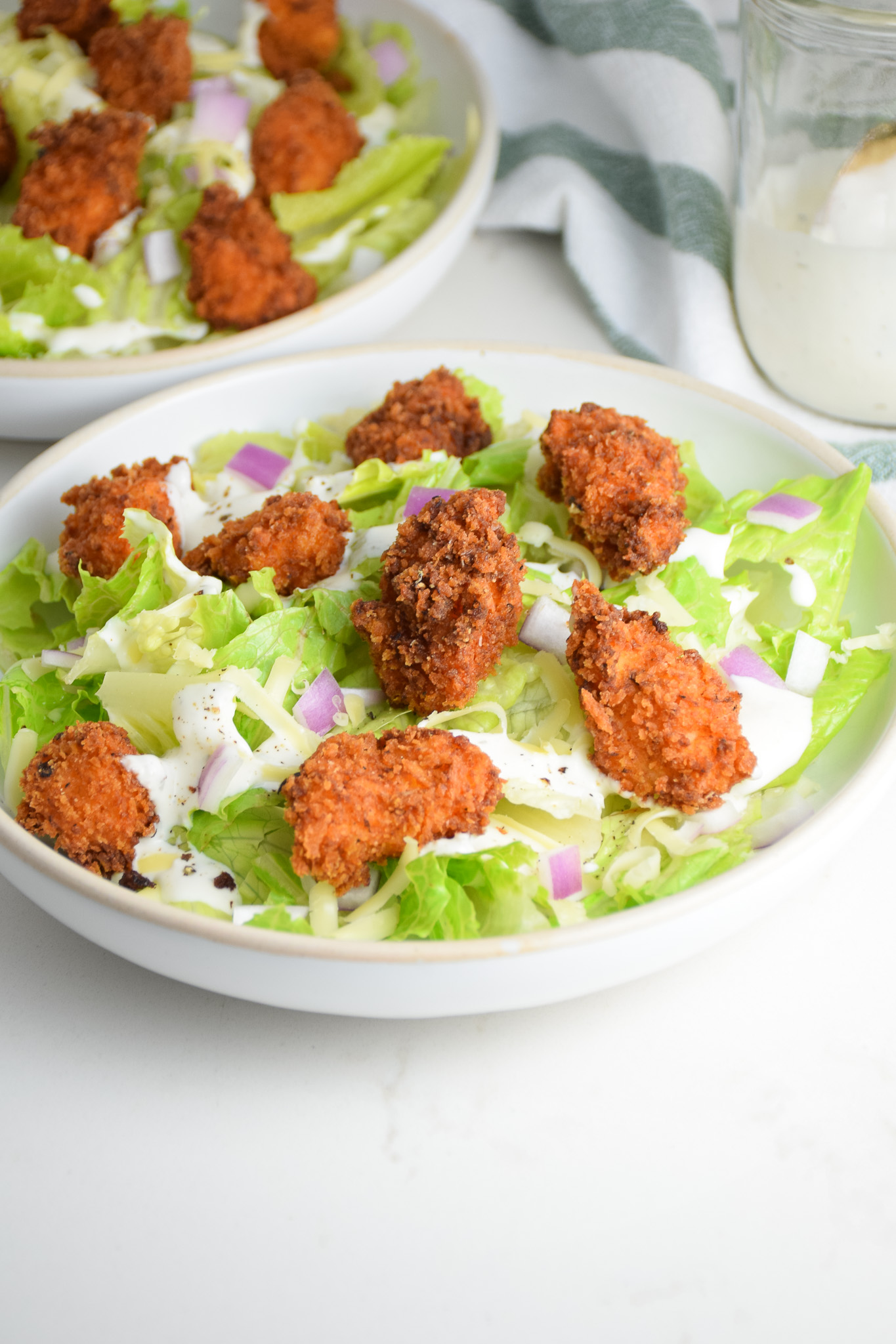 I’ve been keeping a secret from y’all for a while now. This fried chicken salad is one of BMW’s and my favorite meals! We make this a few times a month and it’s always a meal that we can agree on. We’ve really perfected our chicken nuggets and dare I say they are crispier and even better than the ones from Chick-Fil-A! This is such a simple and satisfying salad that your whole family will love.