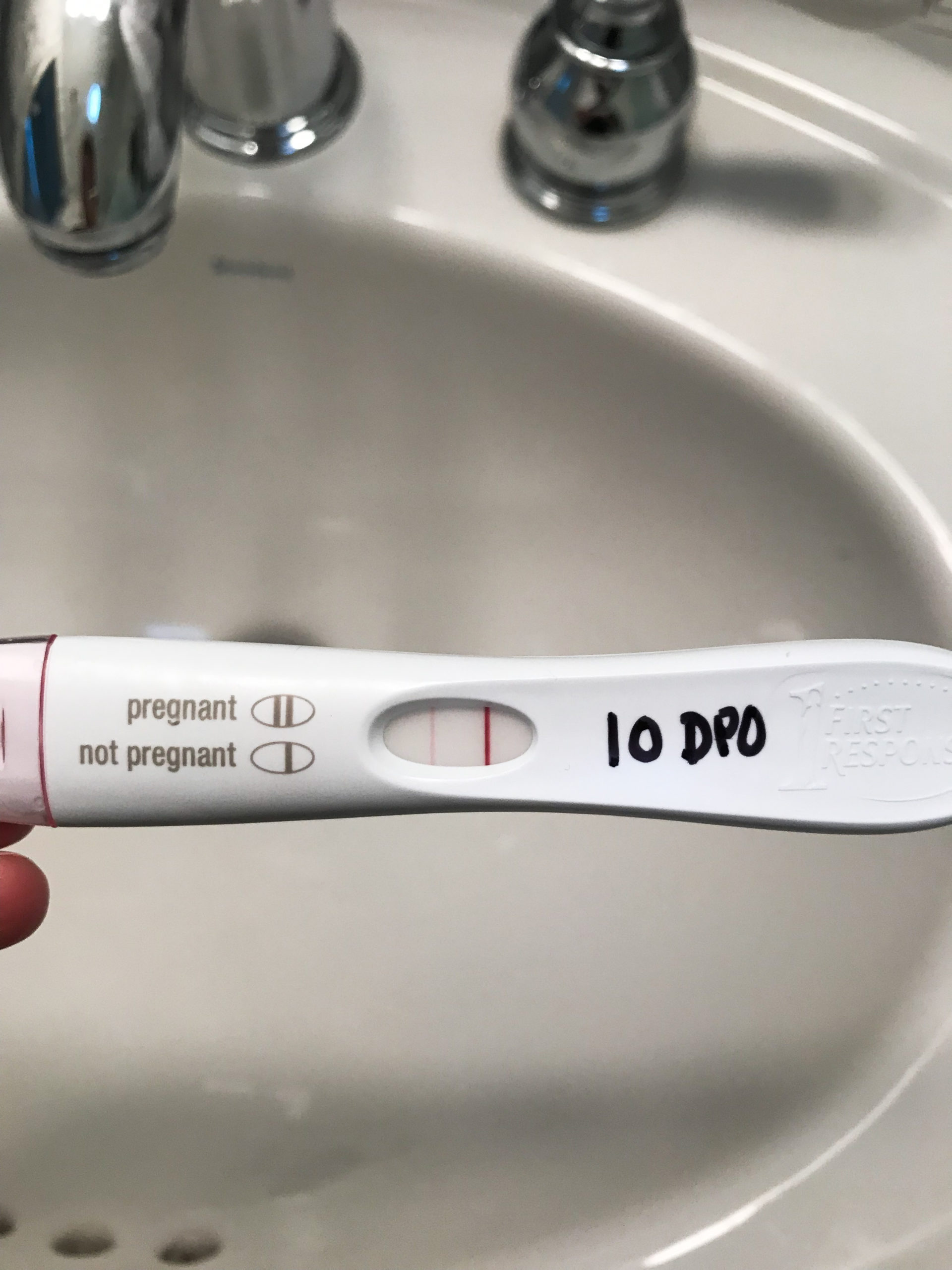 Next morning, same blinking. I had some very, very faint spotting so I figured that I was starting my period. Then I remembered that I had a pregnancy test in the bathroom cabinet and maybe I should take it just to be extra sure. So I took it. Saw nothing and figured that was that. Several minutes later, like after I tossed the thing in the trash, I looked down and saw what I thought was a shadow on the test. I took a closer look and couldn’t believe what I was seeing!