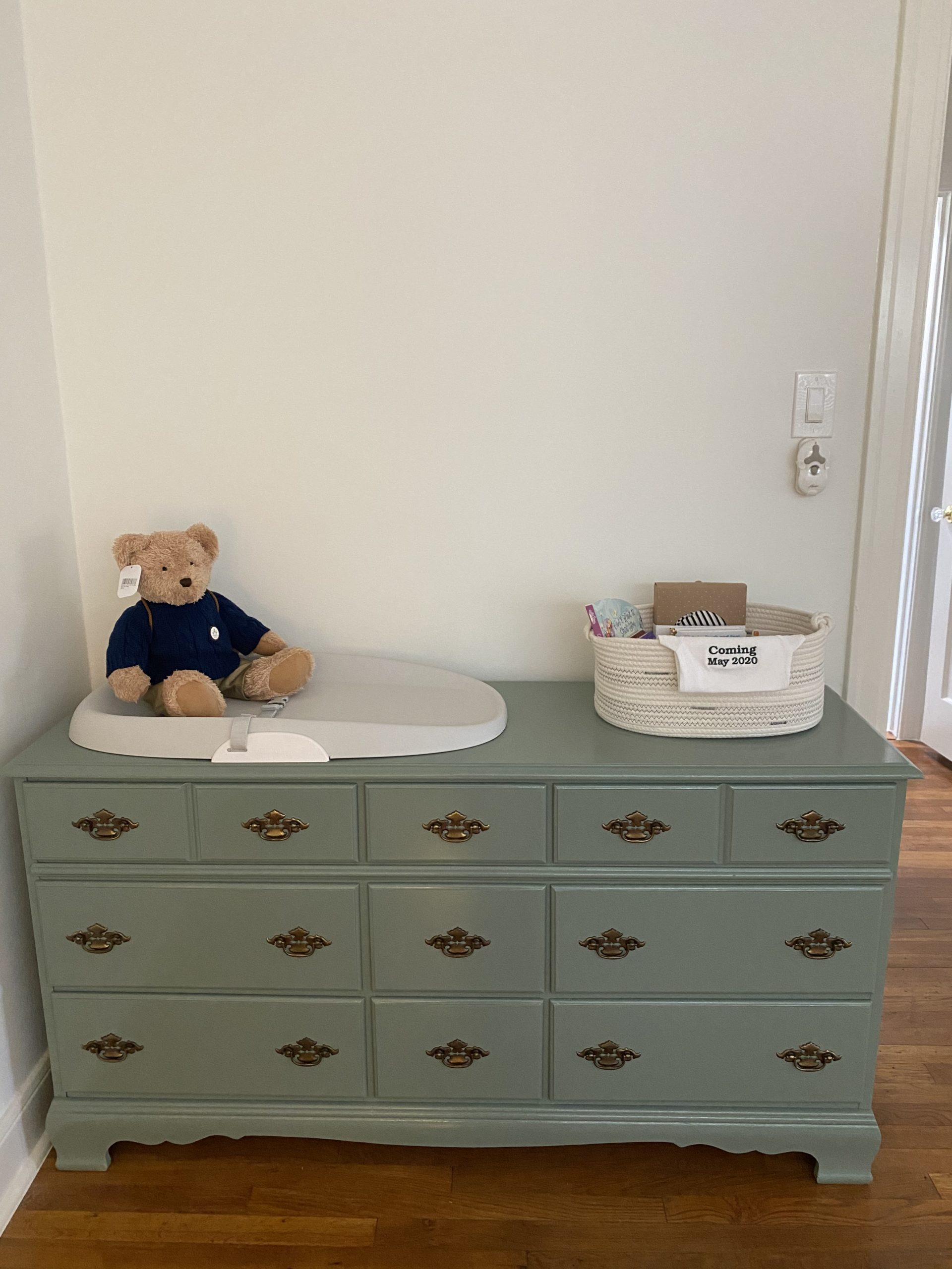After the whirlwind of the holidays, we finished up our Master Built In Closet Renovation! That was a big one for us because prior to the built in closet, BMW was using our guest room closet for his clothes. The guest room is now being prepped for the nursery. We repainted this chest of drawers in a sage green color and are using it as our changing table.