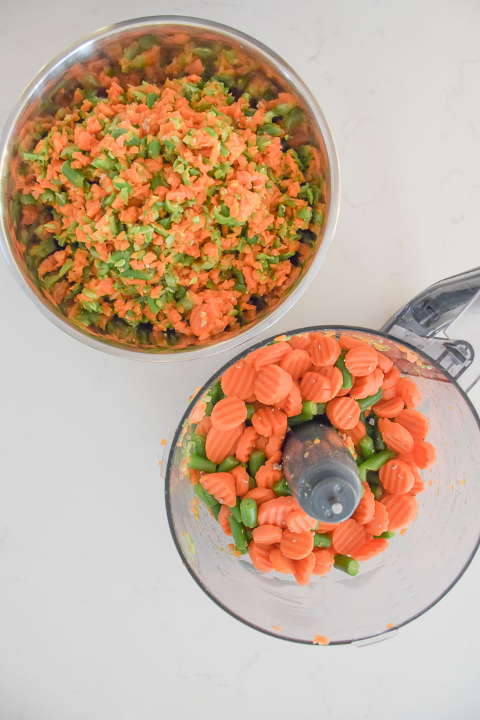 - Put cooked veggies into a food processor and process until they are small but do not over process or they will get liquid-y. See photo.